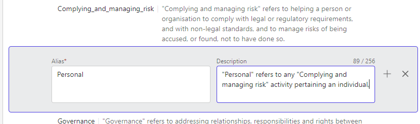 Enter the alias (required) and description for the new value, then press ENTER or select + to submit the value.