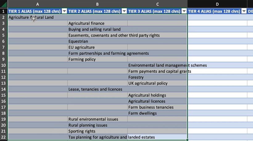 If you are copying and pasting from a spreadsheet, each value in a tier must only be included once in each column, as shown in the following example. An error will be returned if you include Agriculture & Rural Land in all rows in column A, for example.