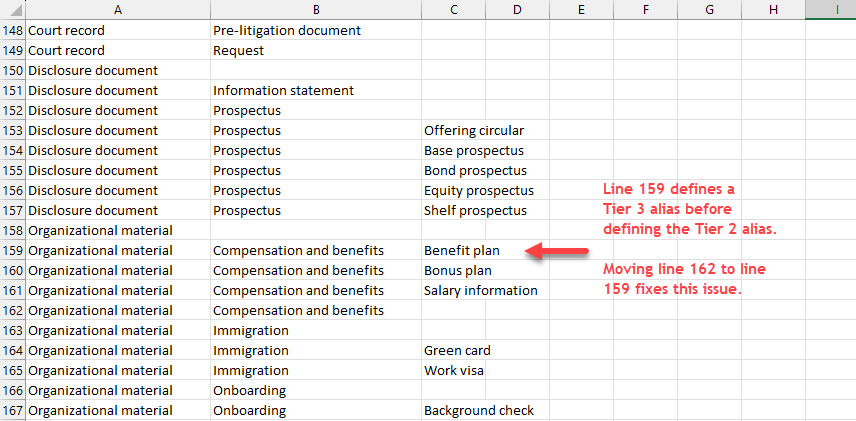 In line 159, a Tier 3 taxonomy value has been defined before the parent Tier 2 value on line 162. In this example, iManage Control Center would generate an error if you attempted to import this incorrectly formatted CSV file.