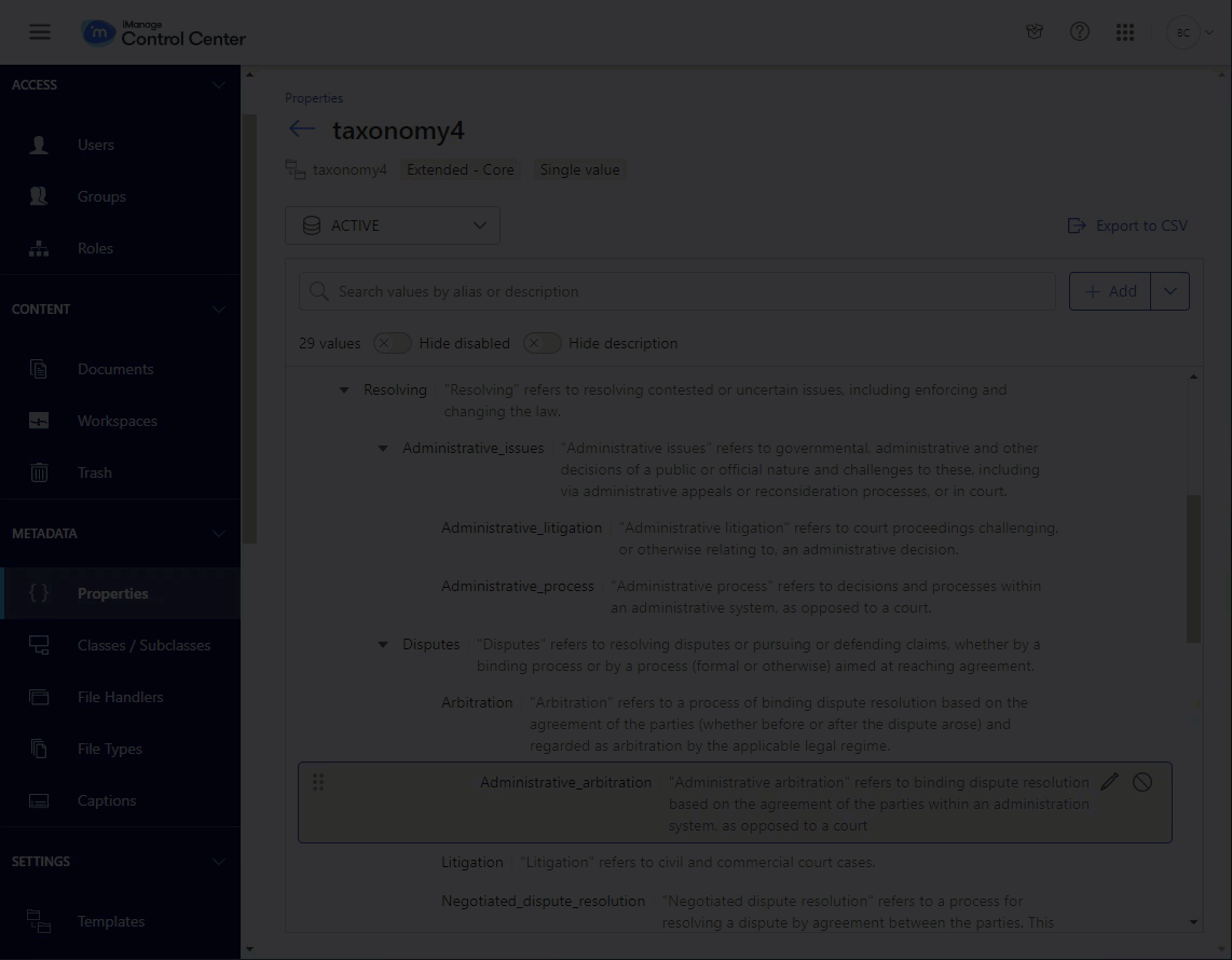 To change the order or hierarchy of values in a taxonomy property, refer to Reorganize taxonomy hierarchy.