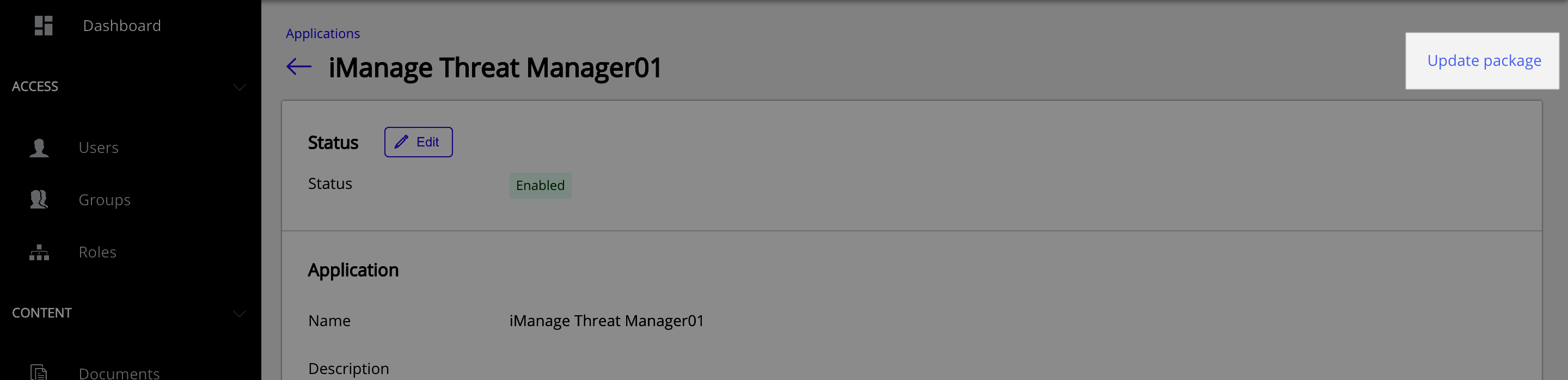 Control Center provides an authorized list of applications which integrate with iManage Work. If an update is made available to any of these applications, an Update Package option appears on the application's details page, as shown in the following figure.