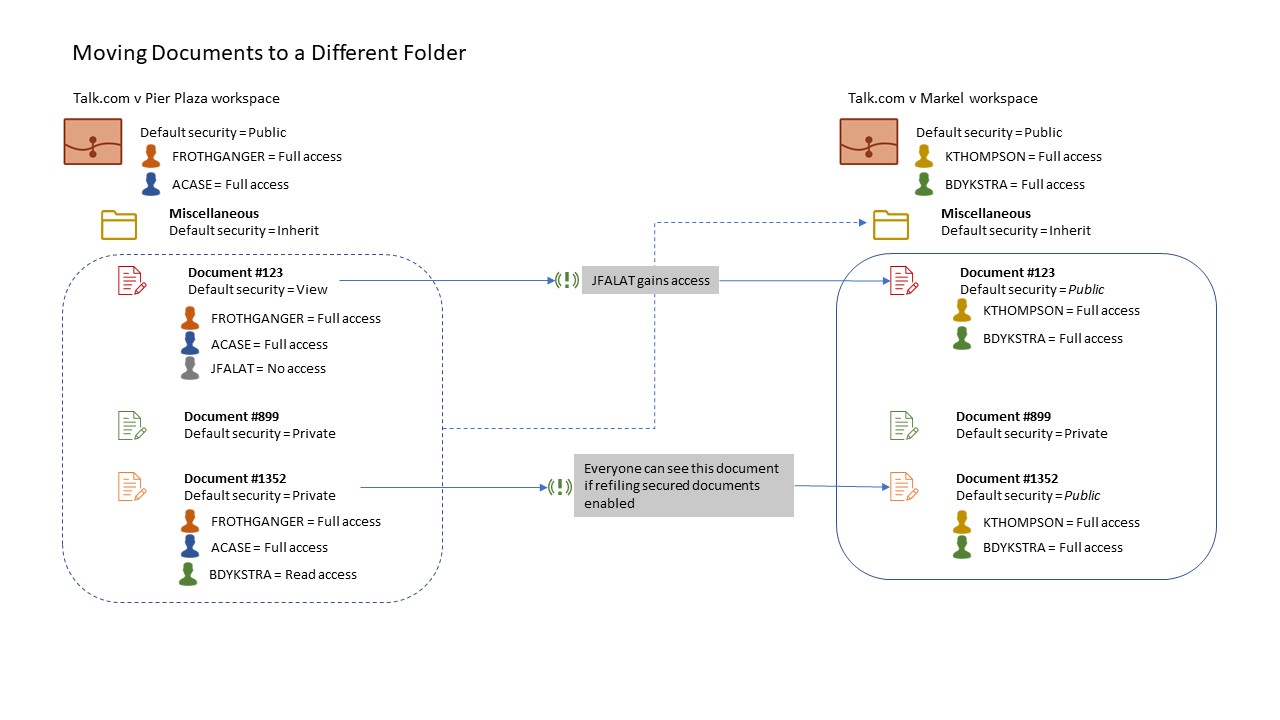 The following case explains the results of a proposed change when a documents is move into a folder. This scenario illustrates where documents, and not the parent folder, are being moved directly to another folder whose default security is Inherit. That means, the folder is treated as if it had the default security of its parent, the workspace.