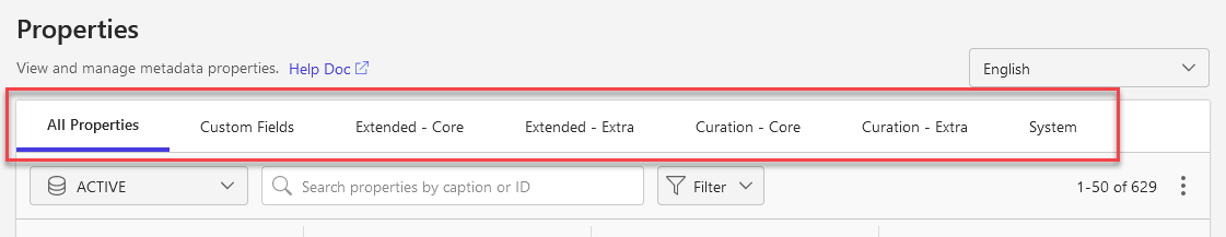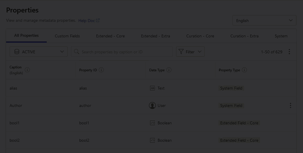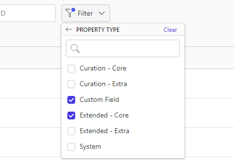 Use the Filter menu to display only the properties of specific data types (Boolean, text, taxonomy, and so on).