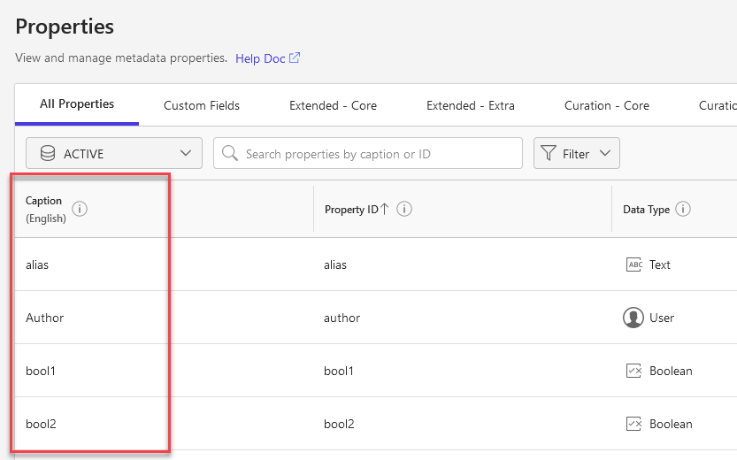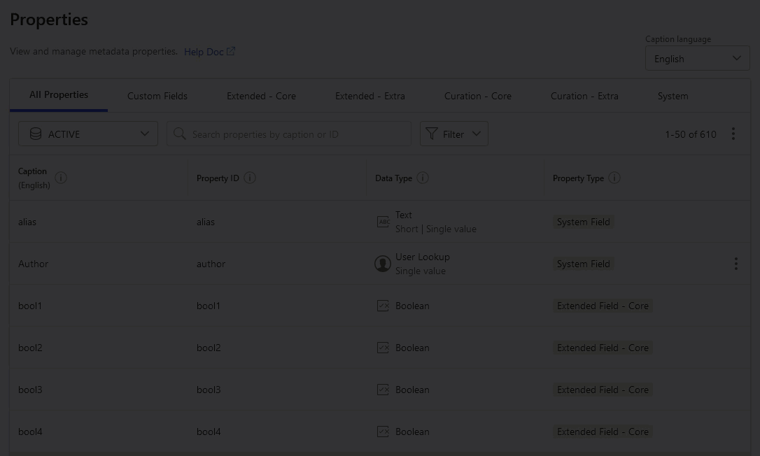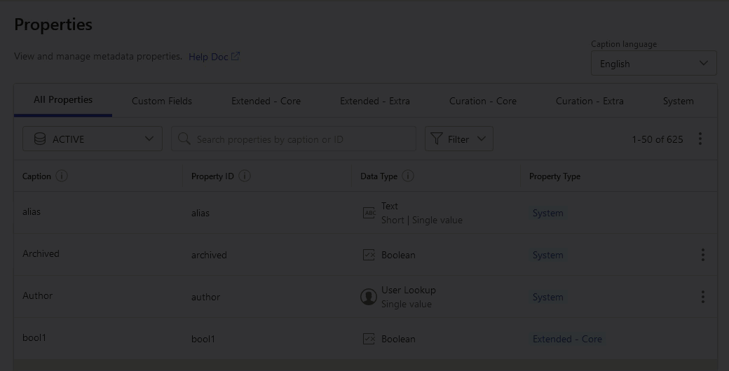 Use the search bar to quickly find a specific property by its Caption or Property ID.