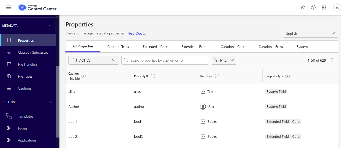 In iManage Control Center, use either of the following options to filter properties by a specific property type.