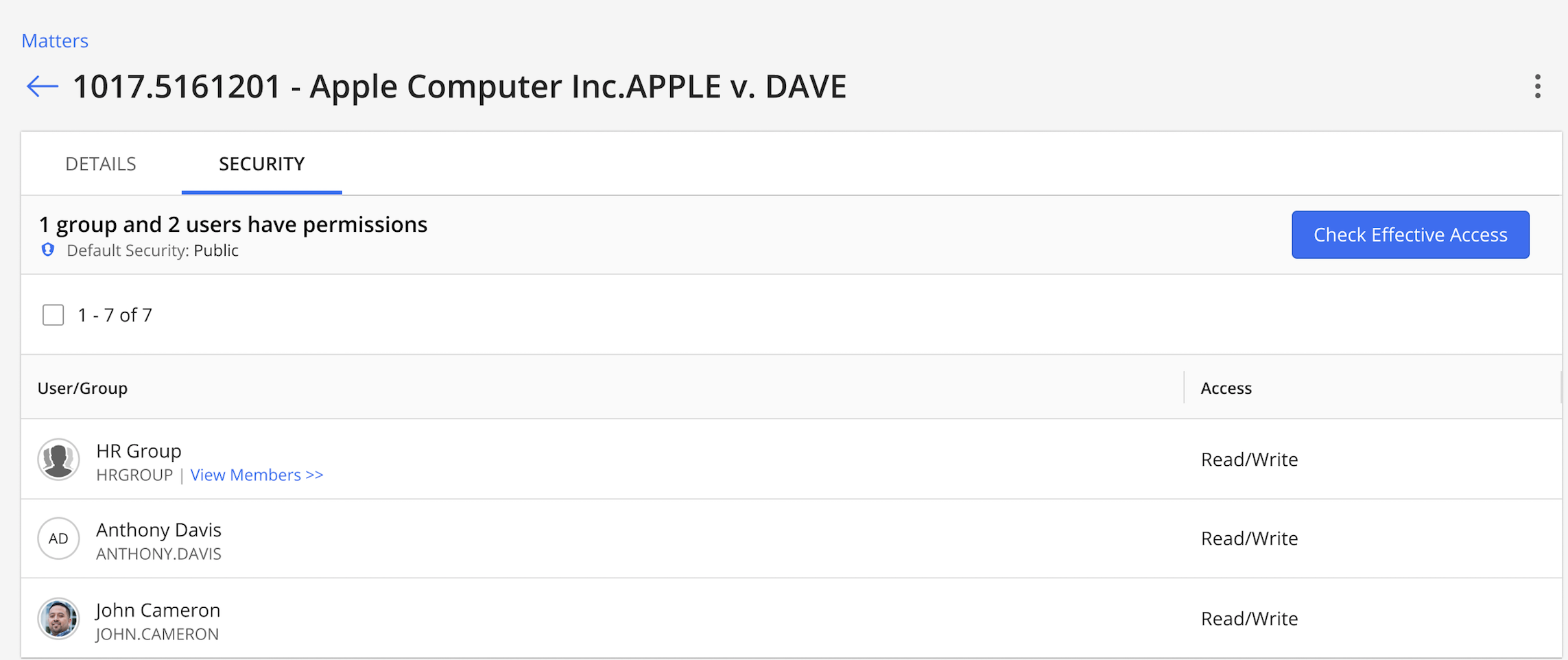 To verify the access rights of a user for a selected workspace, use the Check Effective Access option. It evaluates all permissions (container default security, access permission, group memberships, and role abilities) and is available on the: