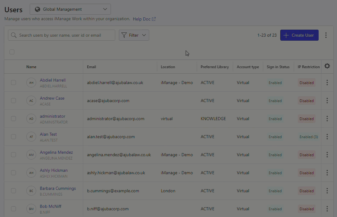 TIP: A user account must exist at the Global Management level before the user can be assigned (granted access) to any iManage Work library.