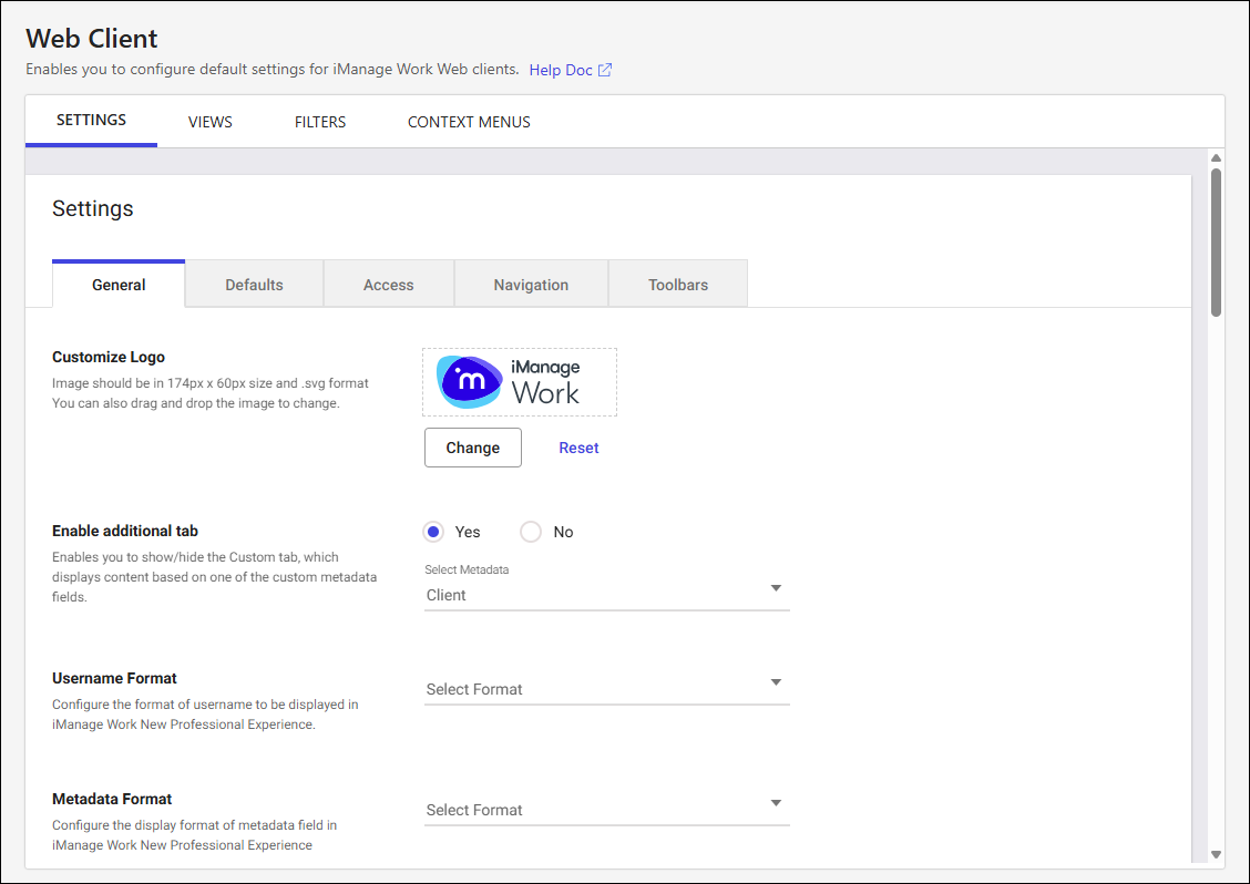 In iManage Control Center, browse to Work Clients > Web Client > Settings > General.