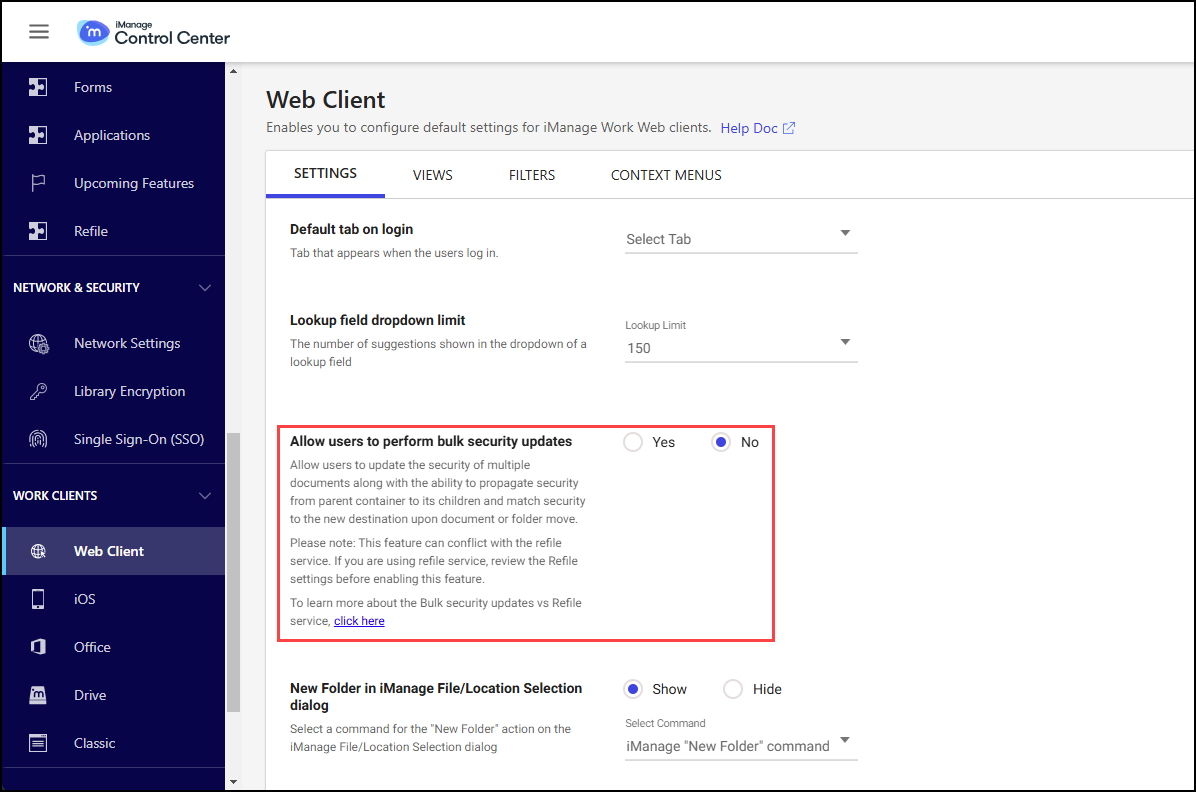 In the February 2025 iManage Work at cloudimanage.com service update, we introduced the Enable bulk security update actions feature. This feature lets administrators grant users the option to perform bulk security updates for documents, emails, workspaces, and folders. When the feature is enabled, several actions become available on the Web Client Context Menus tab in iManage Control Center. For more details about this feature, refer to the February 2025 service update.