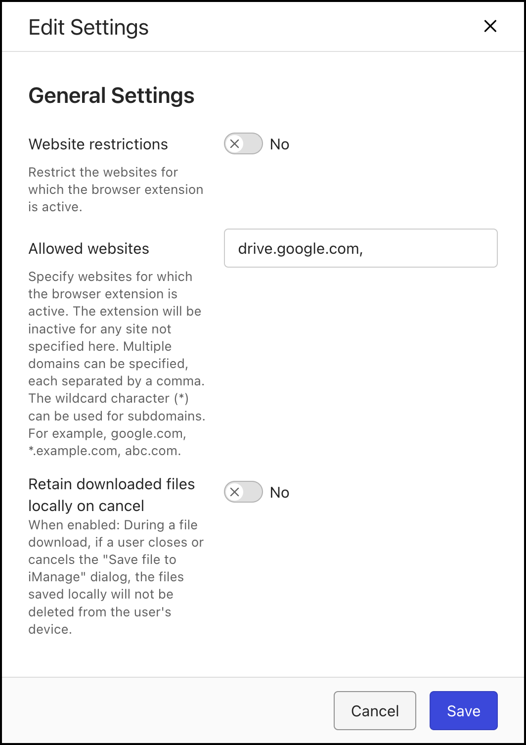 In General Settings, slide the Retain downloaded files locally on cancel toggle to the right. This ensures that downloaded files are retained locally, when users cancel the download.