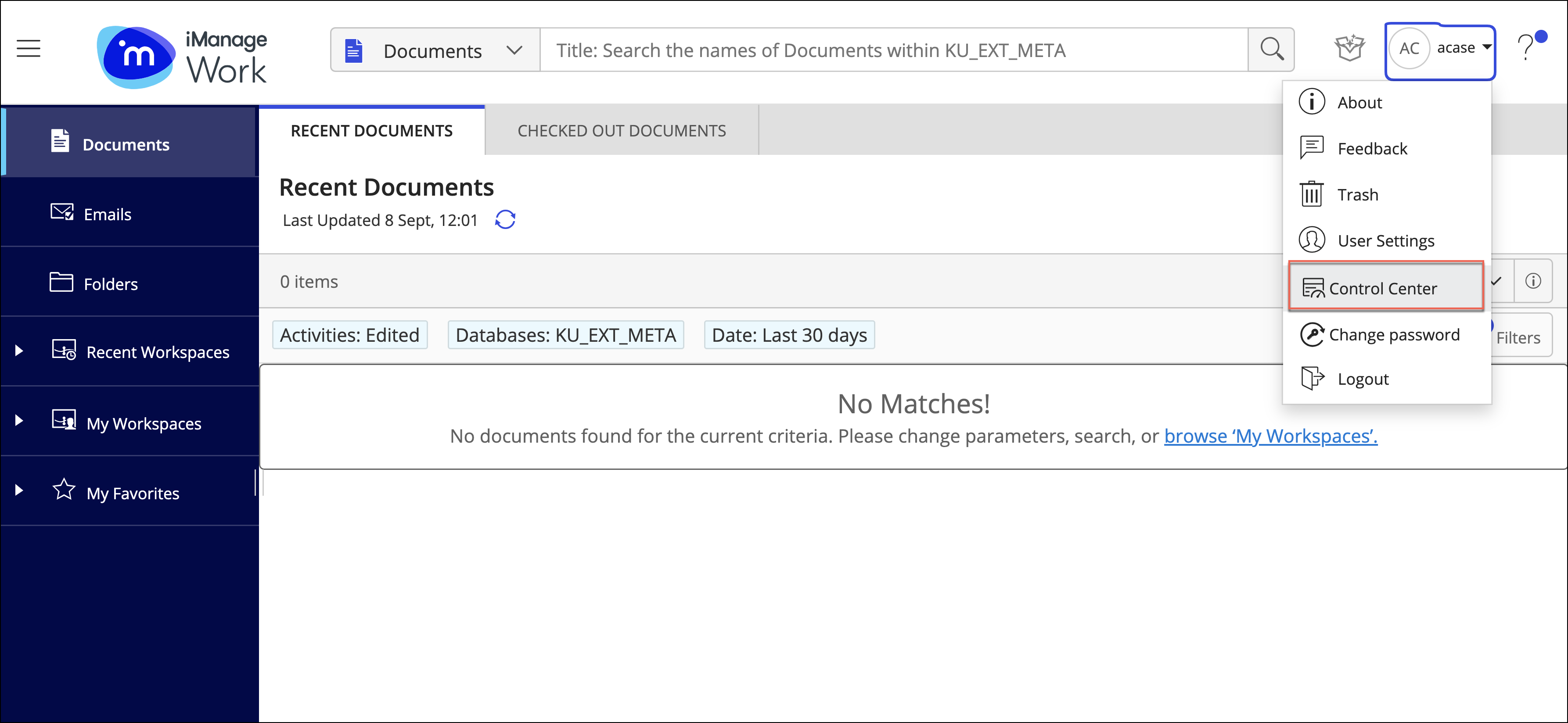 Figure: iManage Work at cloudimanage.com interfaceIn the upper-right corner of the page, select next to the user name, then select Control Center. The iManage Control Center Interface is displayed.