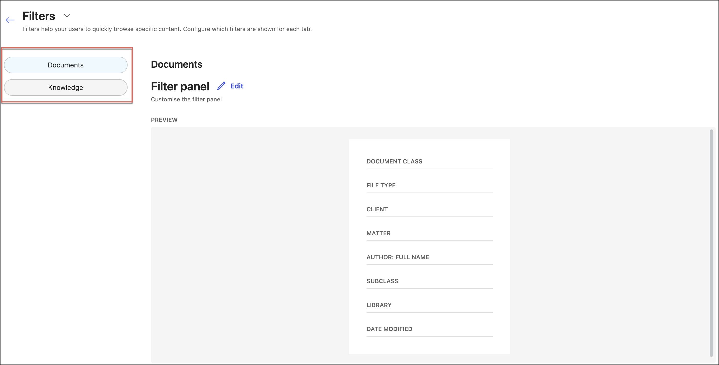 As the iManage Insight+ administrator for your organization, for every tab that’s configured, you can define the filters that will help users refine their search results.