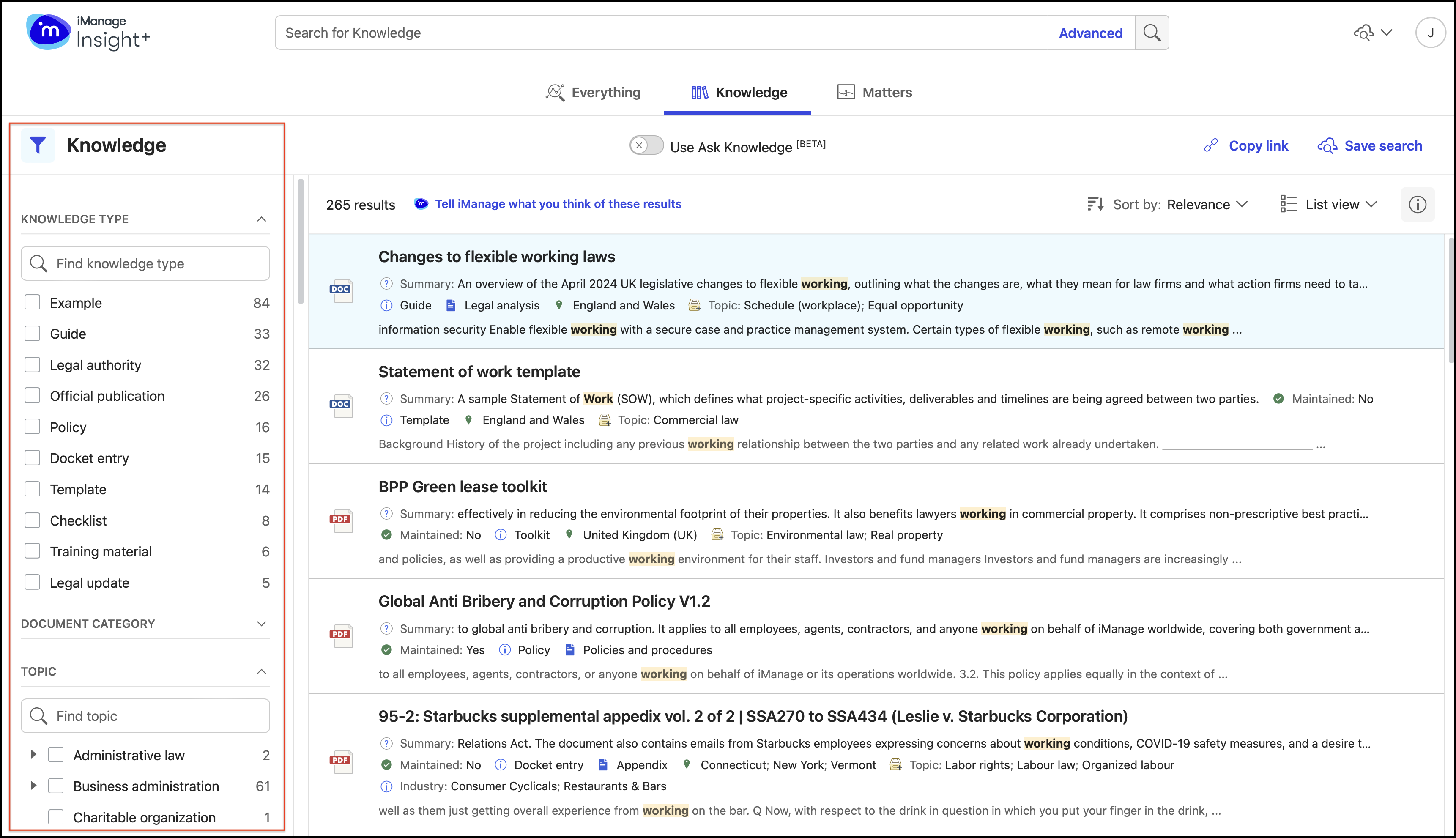 You can add matter-specific filters to the Matters tab. You can also choose to add matter-specific filters to the Everything tab and other documents to help your organizations' users refine their search. These Matter metadata are populated from your business systems data through warehouse integration.