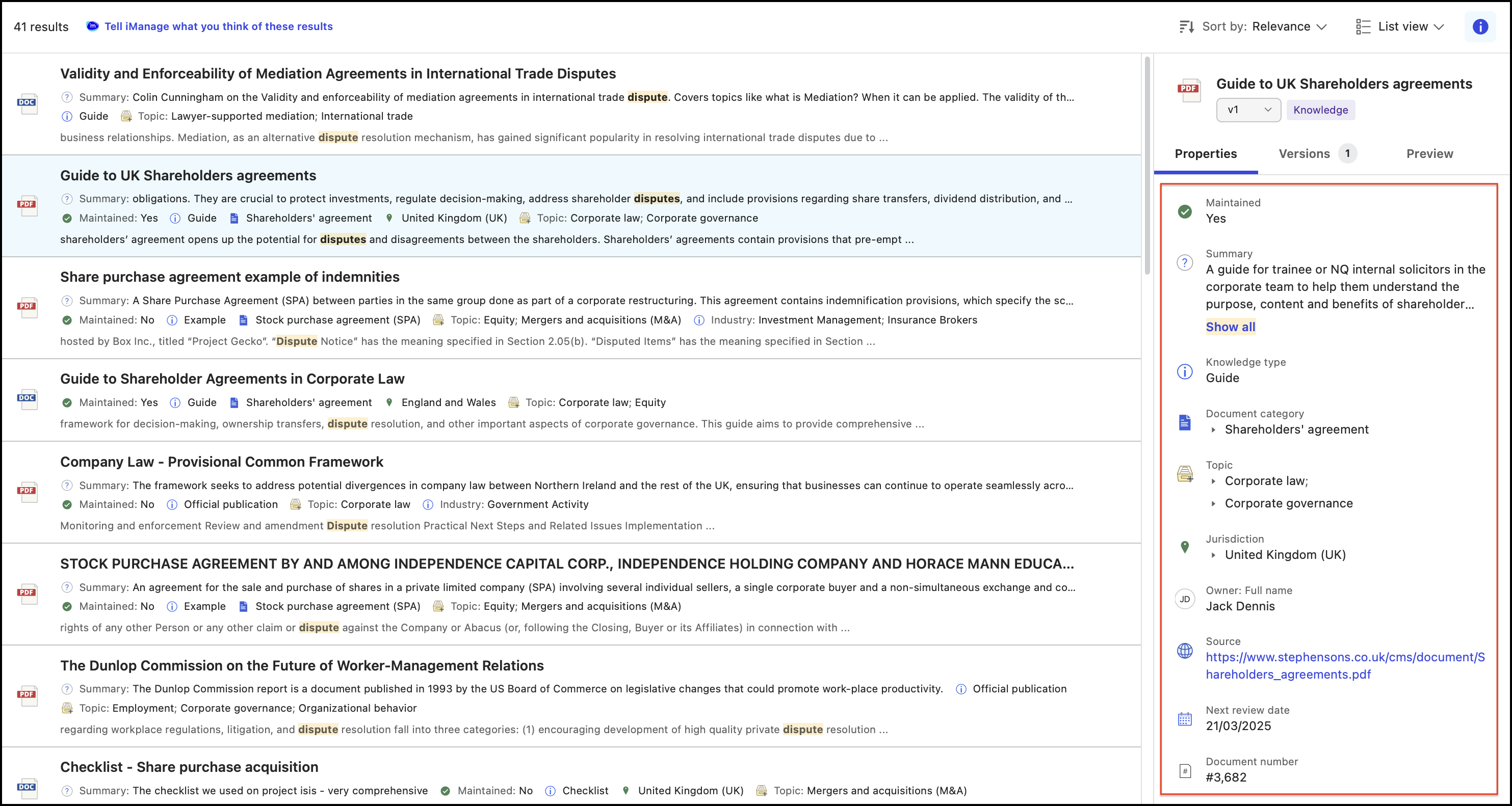 The Properties panel on the search results page displays certain predefined metadata for the selected search item. The list of metadata displayed can be configured in iManage Insight+ administration interface.