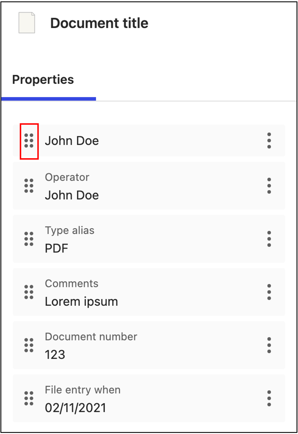 Figure: Reorder sequence of metadata propertiesAfter completing the required actions on the page, select Save. The metadata properties you saved are displayed in the Properties panel for the search result item.