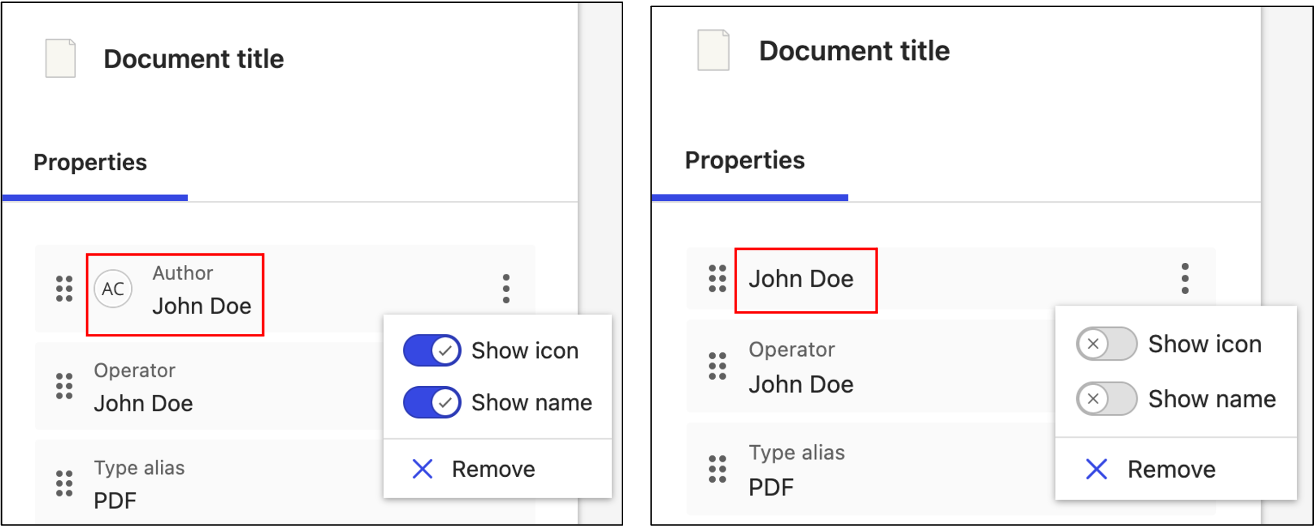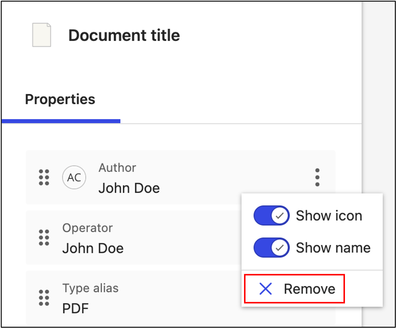 Figure: Remove selected propertyYou can turn on or turn off the visibility of the icon and name per property. Select and then toggle the respective sliders—left to turn off the feature, and right to turn it on. The application displays the Alias by default, but you have the option to display the description as well. However, if the Alias, and the Description are the same, it'll result in duplicate information being displayed.
