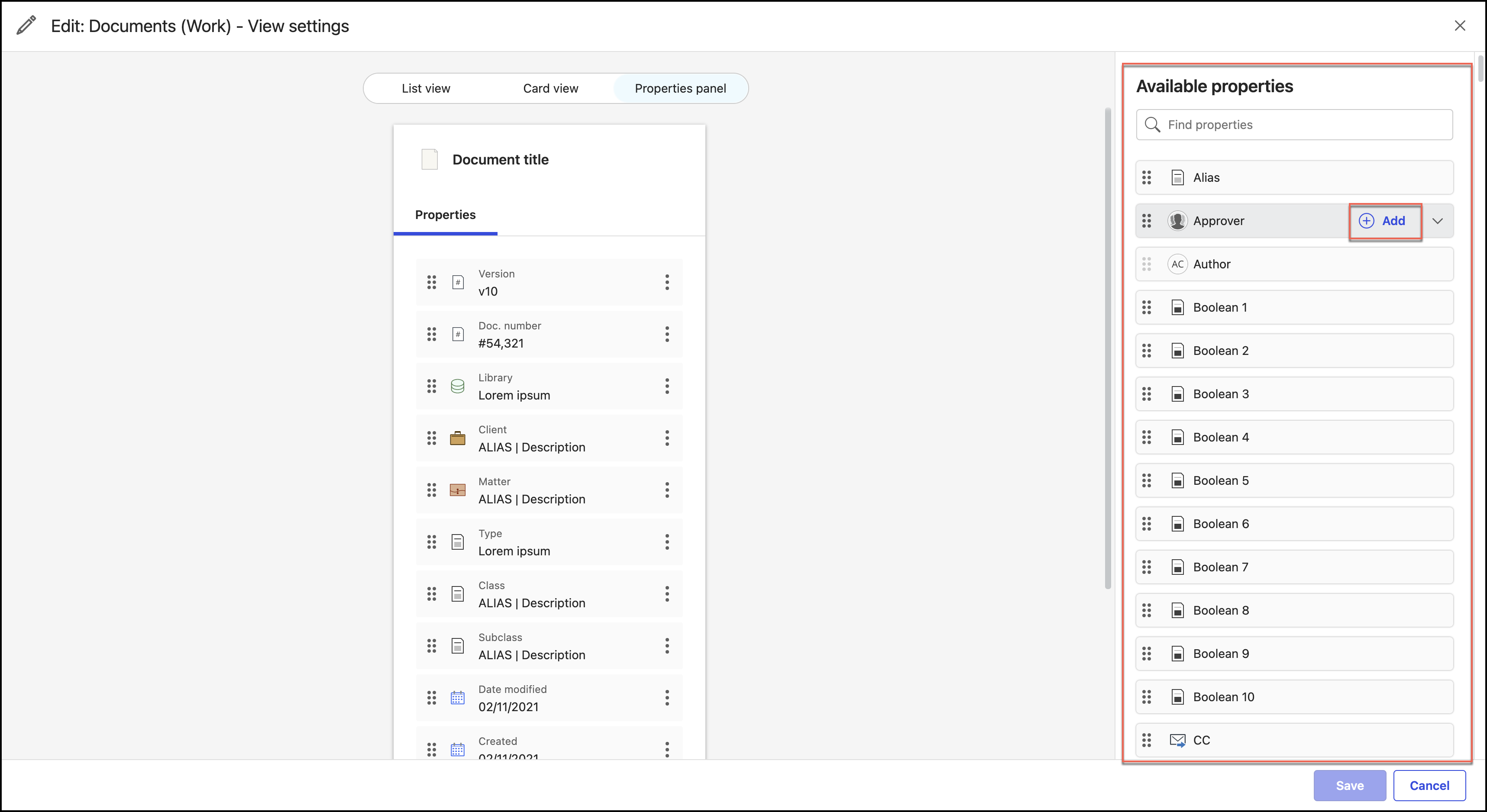 If you know the property you're looking for, you can search for it using the Find properties search field. All properties that are already added to the view settings for the content type in the Available properties panel, appear grayed out. For example, Author is grayed out as it's already a property added in the Properties panel for the content type.Figure: Available properties pane