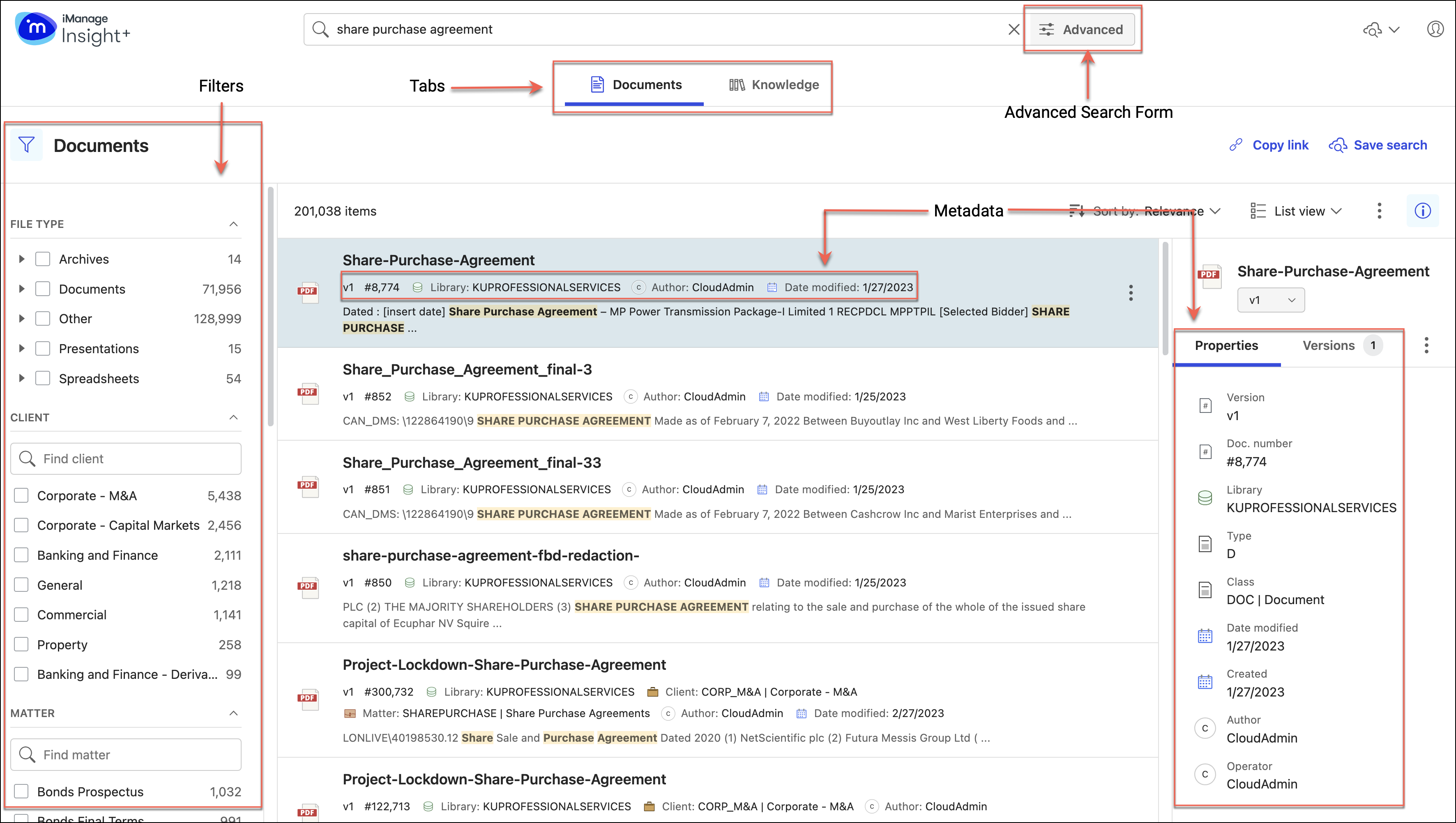 Your iManage Insight+ repository may consist of millions of documents. The search interface is designed to allow for exploratory searches in unfamiliar areas, information gathering without specific documents in mind, and locating specific documents when uncertain about their details.