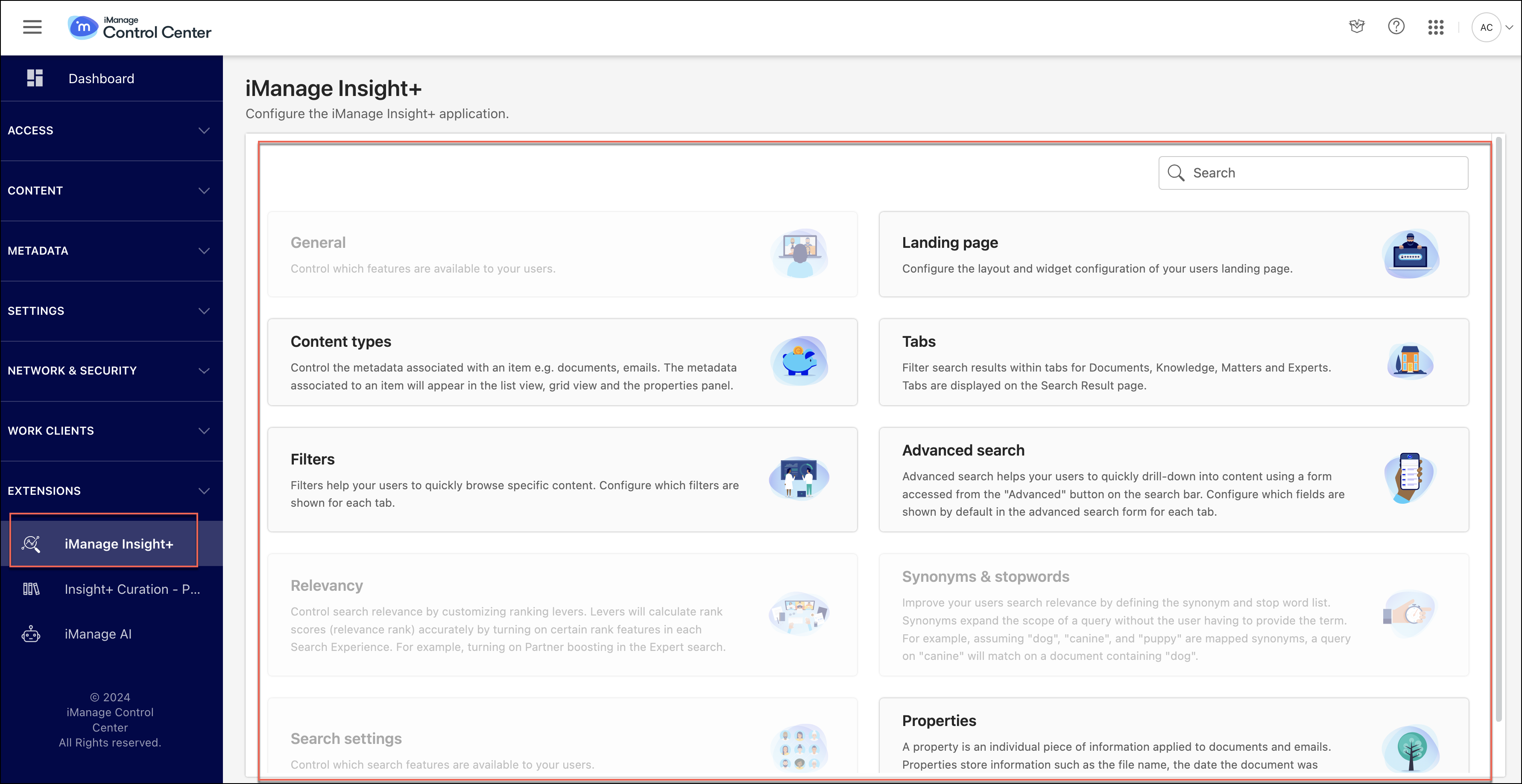 Content types | Lets you configure the metadata properties displayed for a search result in the iManage Insight+ search interface. |