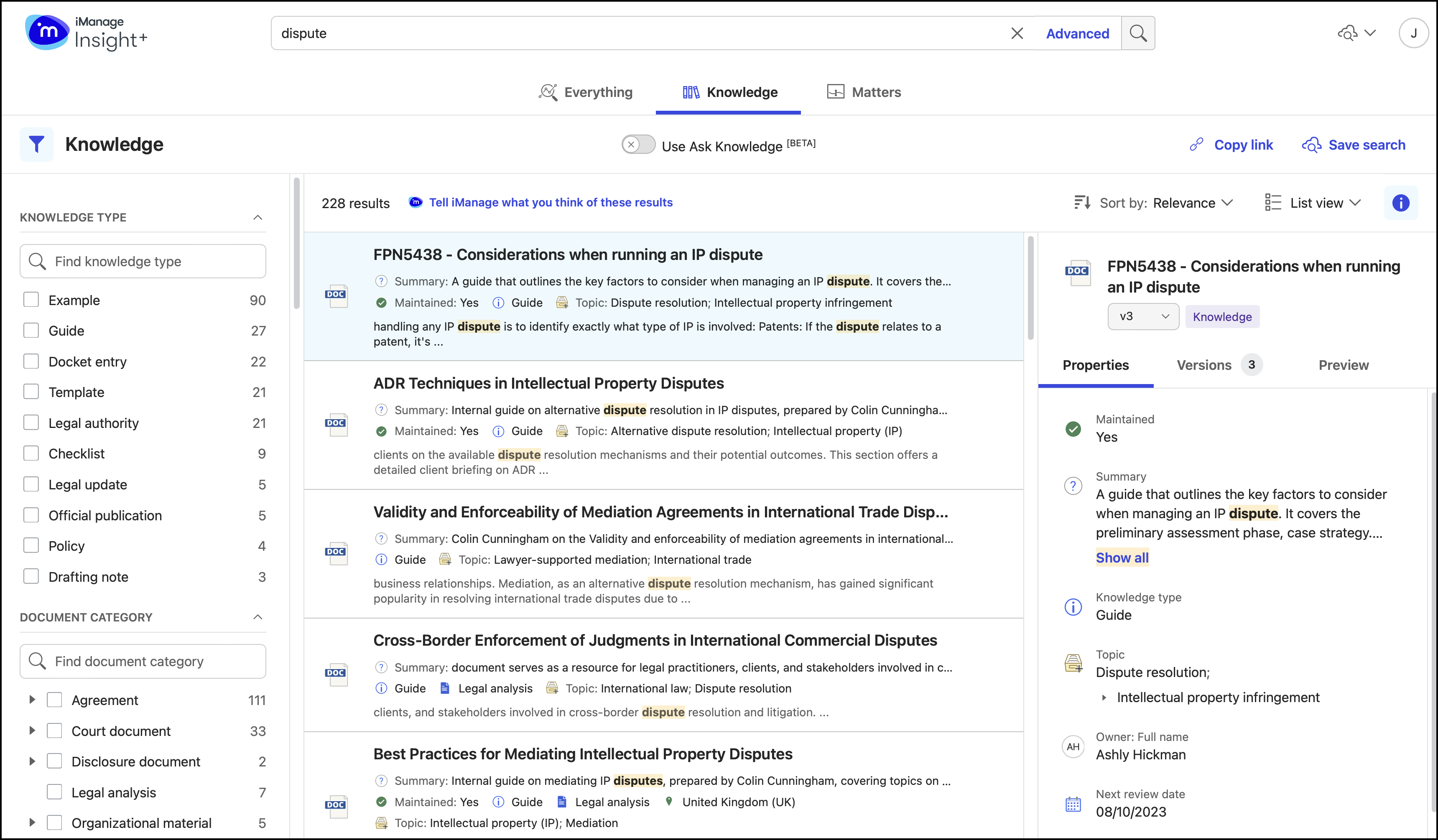 The iManage Insight+ user interface displayed after successful authentication is in English (UK).