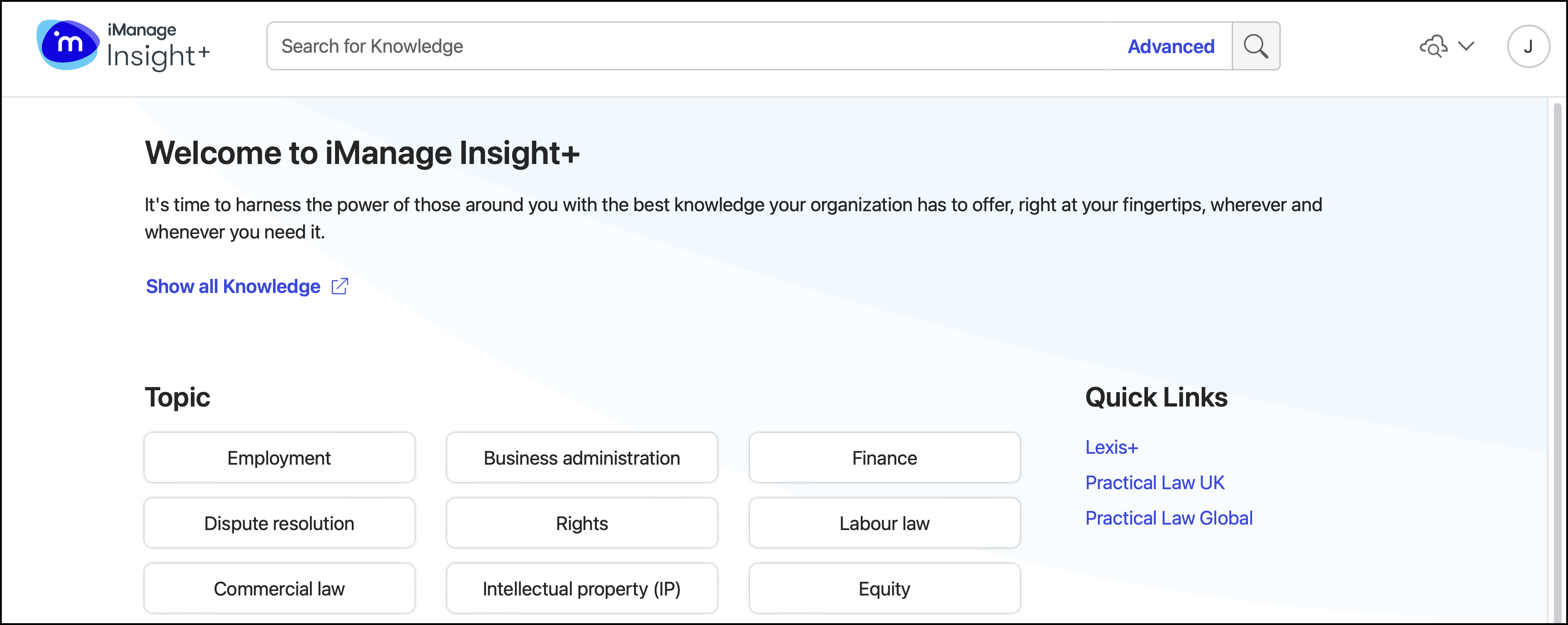 Landing page is an optional feature and you may or may not see this page when you sign into iManage Insight+ application based on whether it's been configured for your organization or not. This page is configured by your iManage Insight+ administrator.