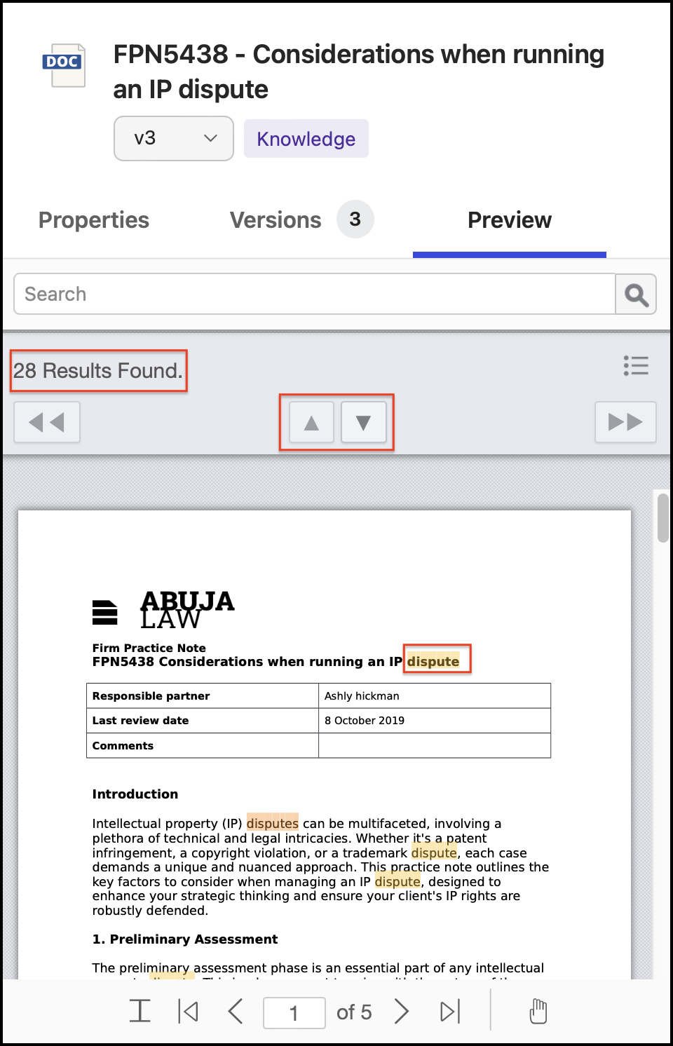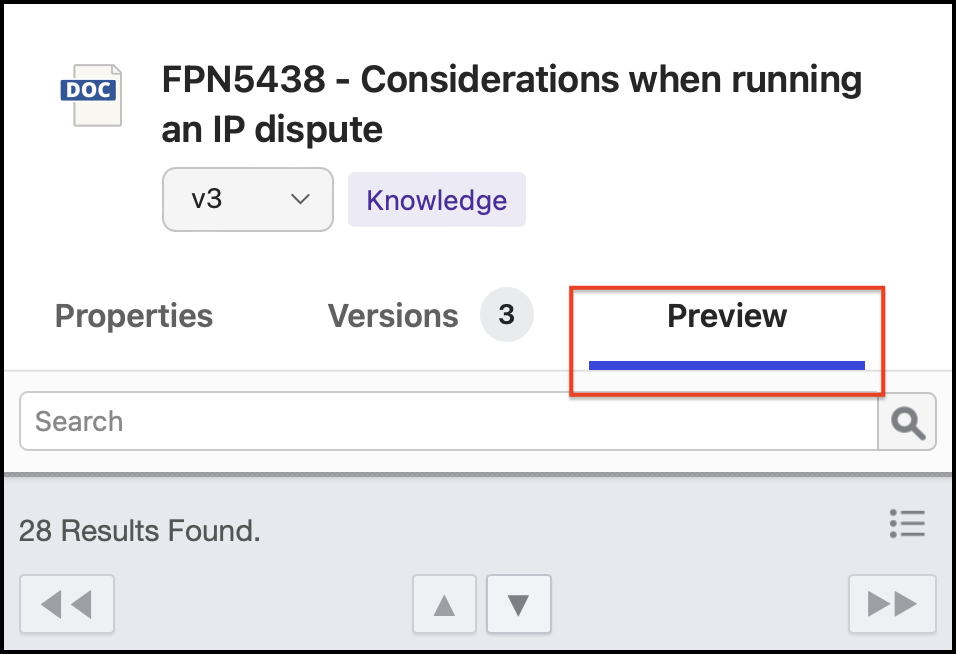 Figure: Preview panel optionThe document preview loads in a few moments. The search phrase is highlighted wherever it occurs in the document. The number of times the term/phrase appears in the document is mentioned. You can use to move to the previous and next highlights, respectively.