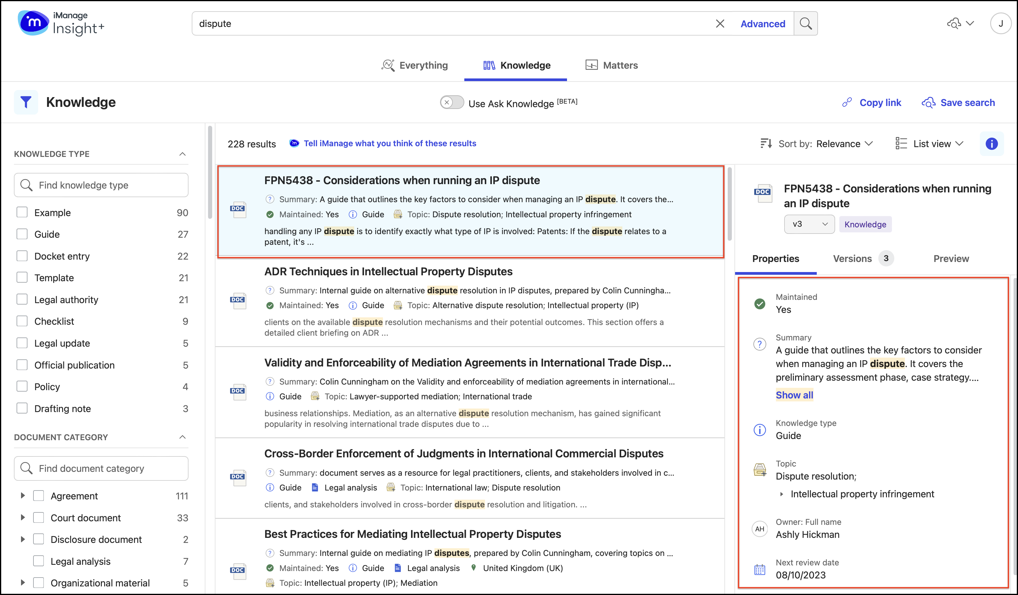 In the search results pane, select anywhere in the tile for the document that you want to preview. The Properties panel appears on the right side of the page.