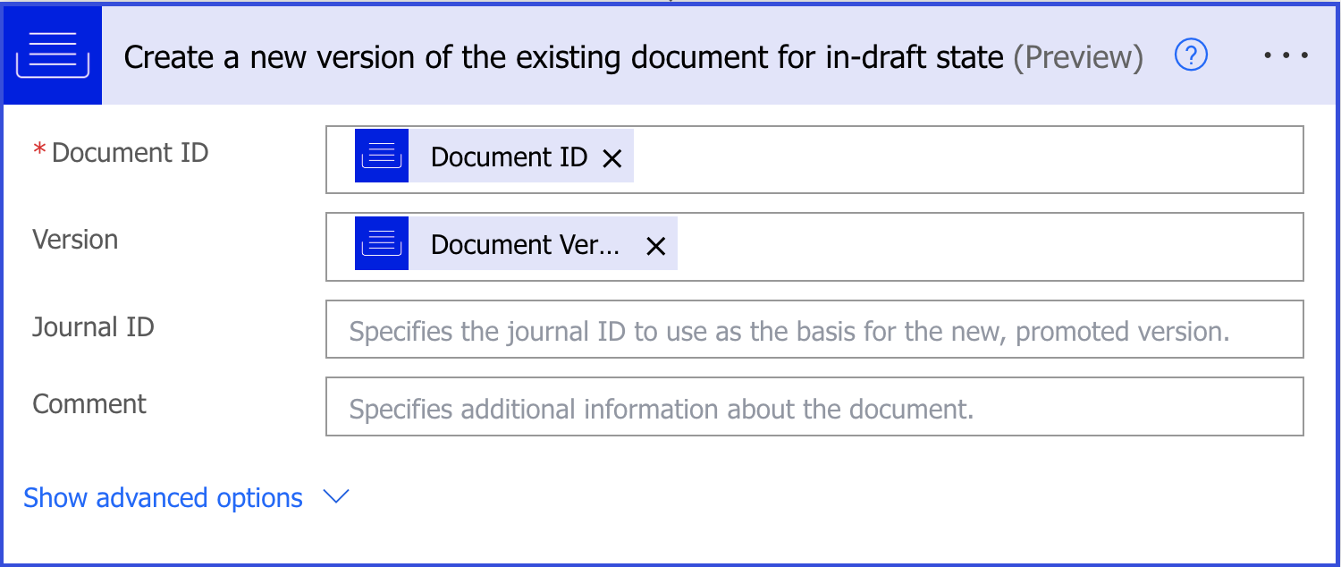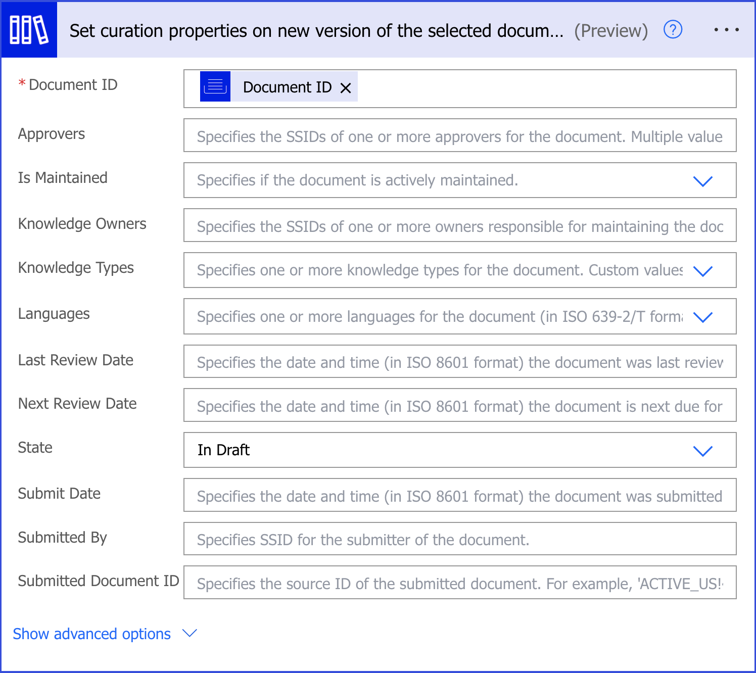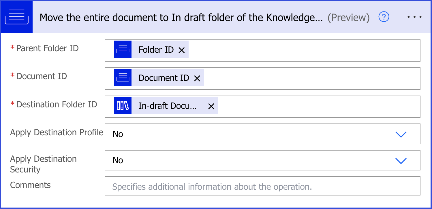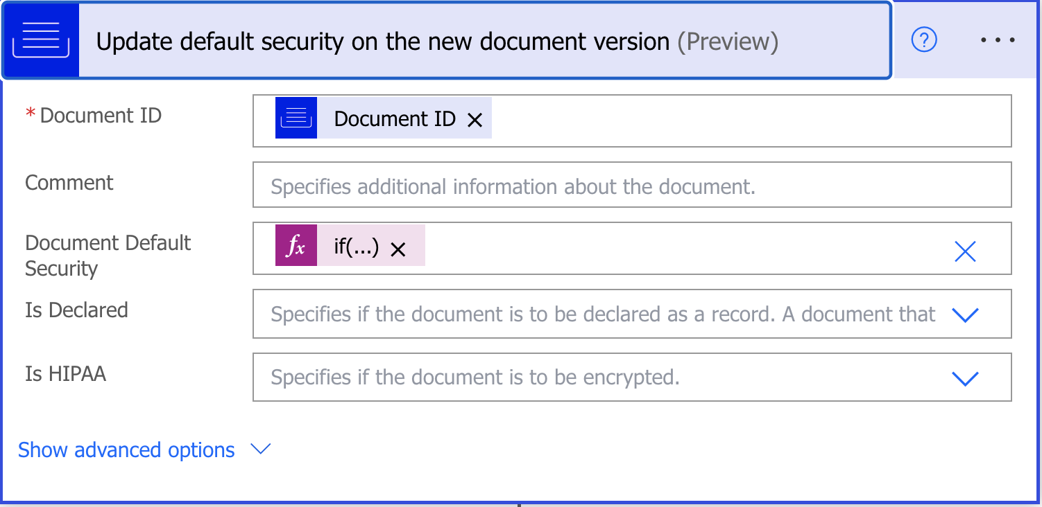 Return Folder ID: Specifies if the document’s folder ID is required by the workflow. This is helpful if you want to use a specific folder where the selected document is located further in your Power Automate script. Set this value to Yes.