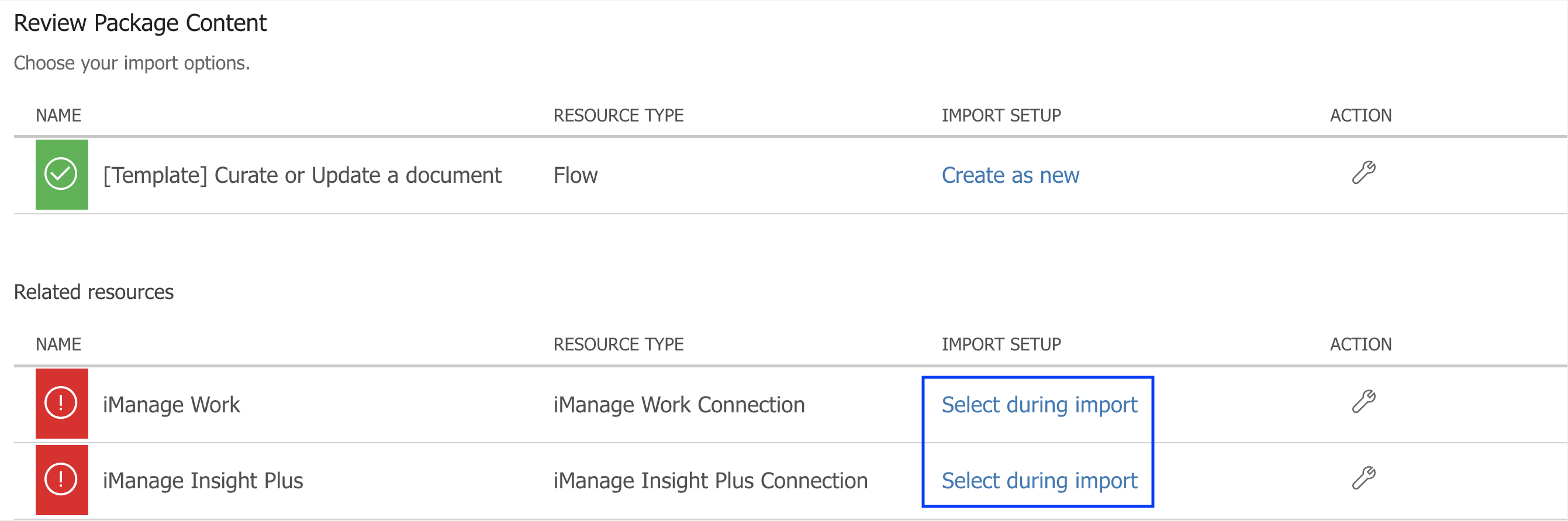 Figure: Reviewing package contentsTo complete uploading the templates, choose Select during import to establish a connection for each resource type that has a warning indication beside them. The Import setup dialog box appears.