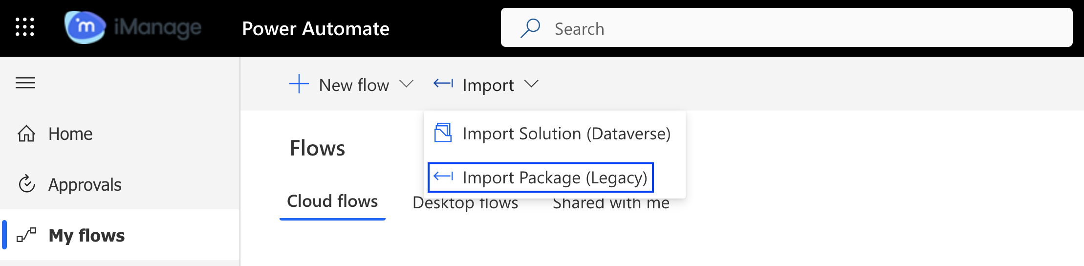 In the left pane, select My flows > Import > Import Package (Legacy).