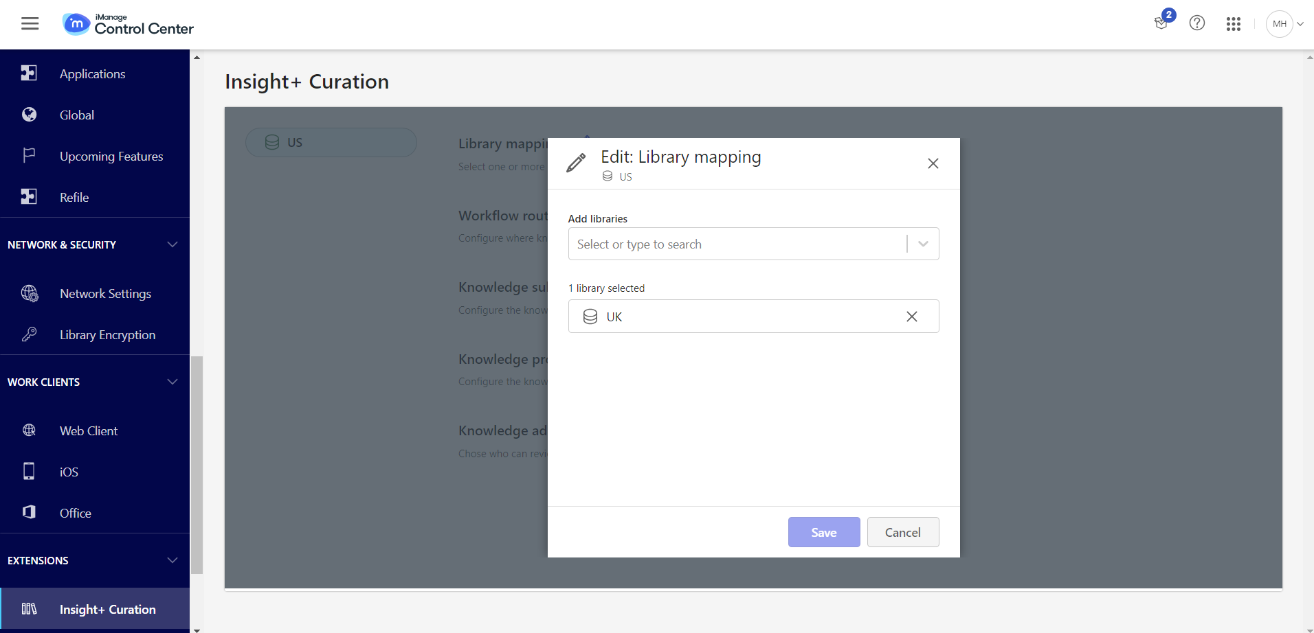Active libraries are locations in iManage Work where documents are stored before Curation. Libraries that are designated as Knowledge libraries have Curation properties enabled. Curation properties are special-purpose properties that can be applied to a knowledge document. Library mapping is important for curation, as the workflow for Submit as Knowledge for the given non-knowledge library is decided by the library mapping and the workflow routing in the knowledge library.