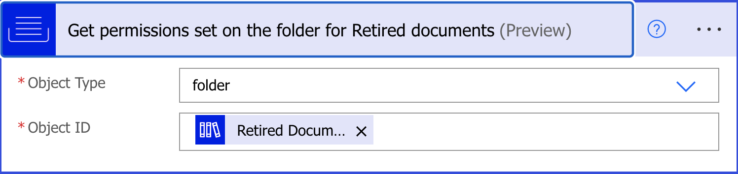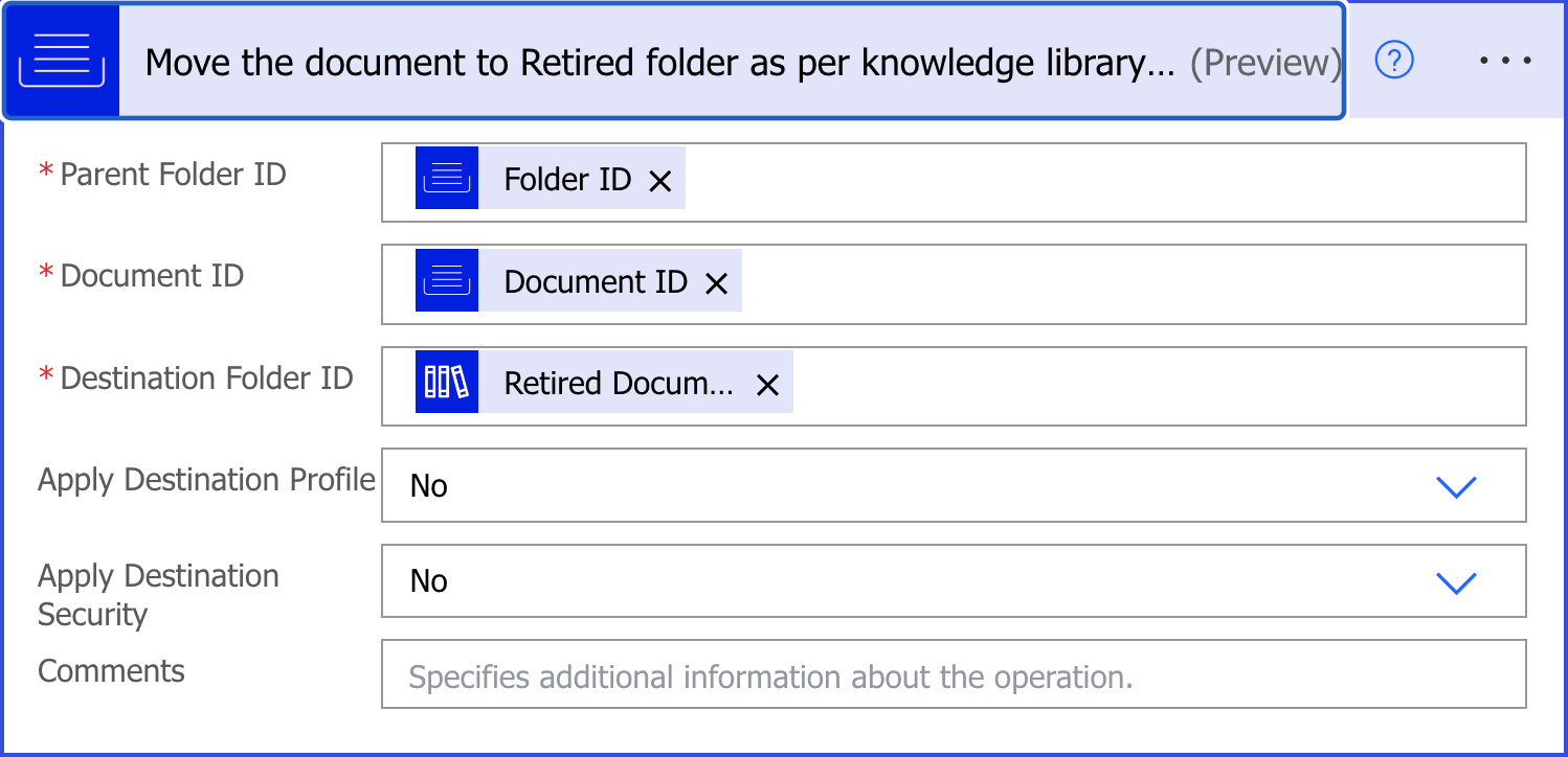 Return Folder ID: Specifies if the document’s folder ID is required by the workflow. This is helpful if you want to use a specific folder where the selected document is located further in your Power Automate script. Set this value to Yes.