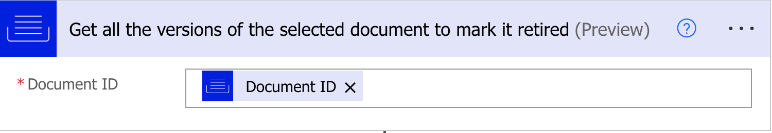 iManage Work connector Description: Get all the versions of the selected document to mark it retired | Document ID: ID of the document. |