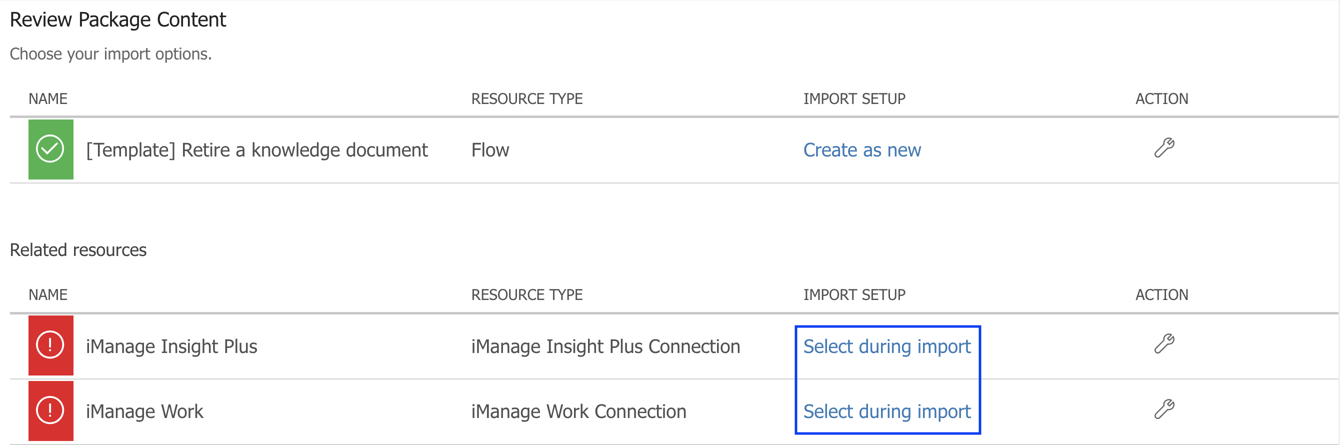 To complete uploading the templates, choose Select during import to establish a connection for each resource type that has a warning indication beside them.