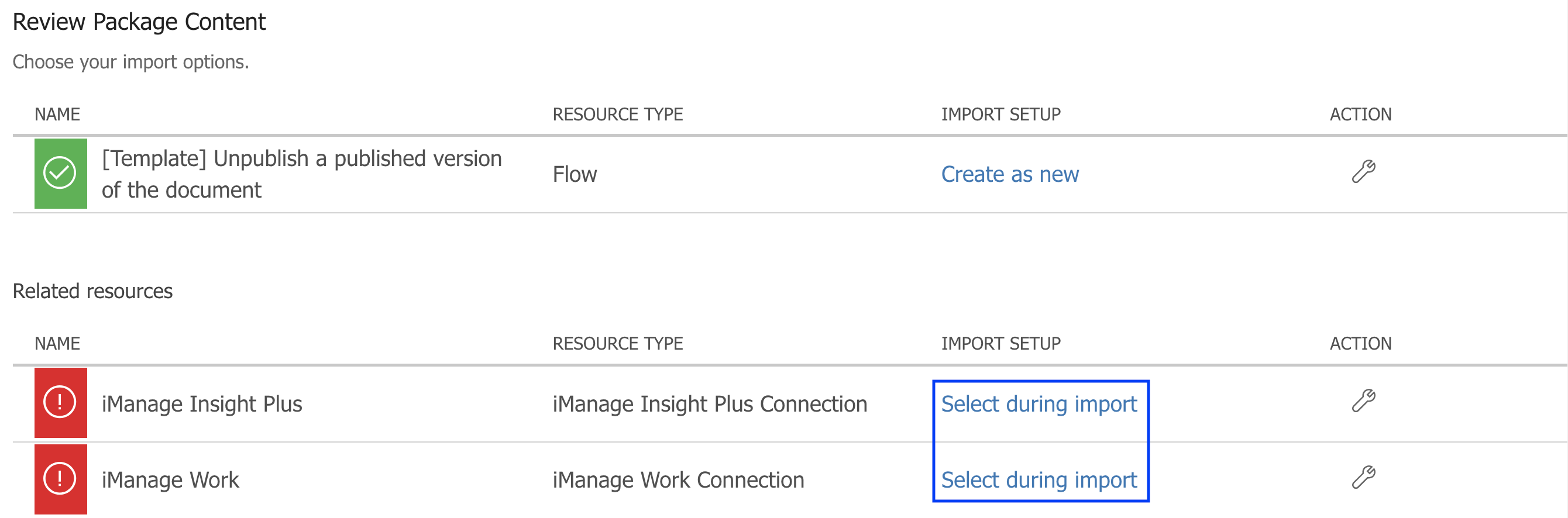 To complete uploading the templates, choose Select during import to establish a connection for each resource type that has a warning indication beside them.