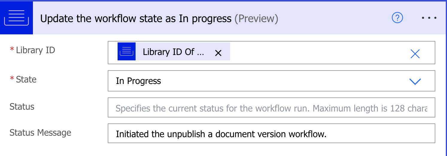 iManage Work connector Description: Update the workflow state as In progress |