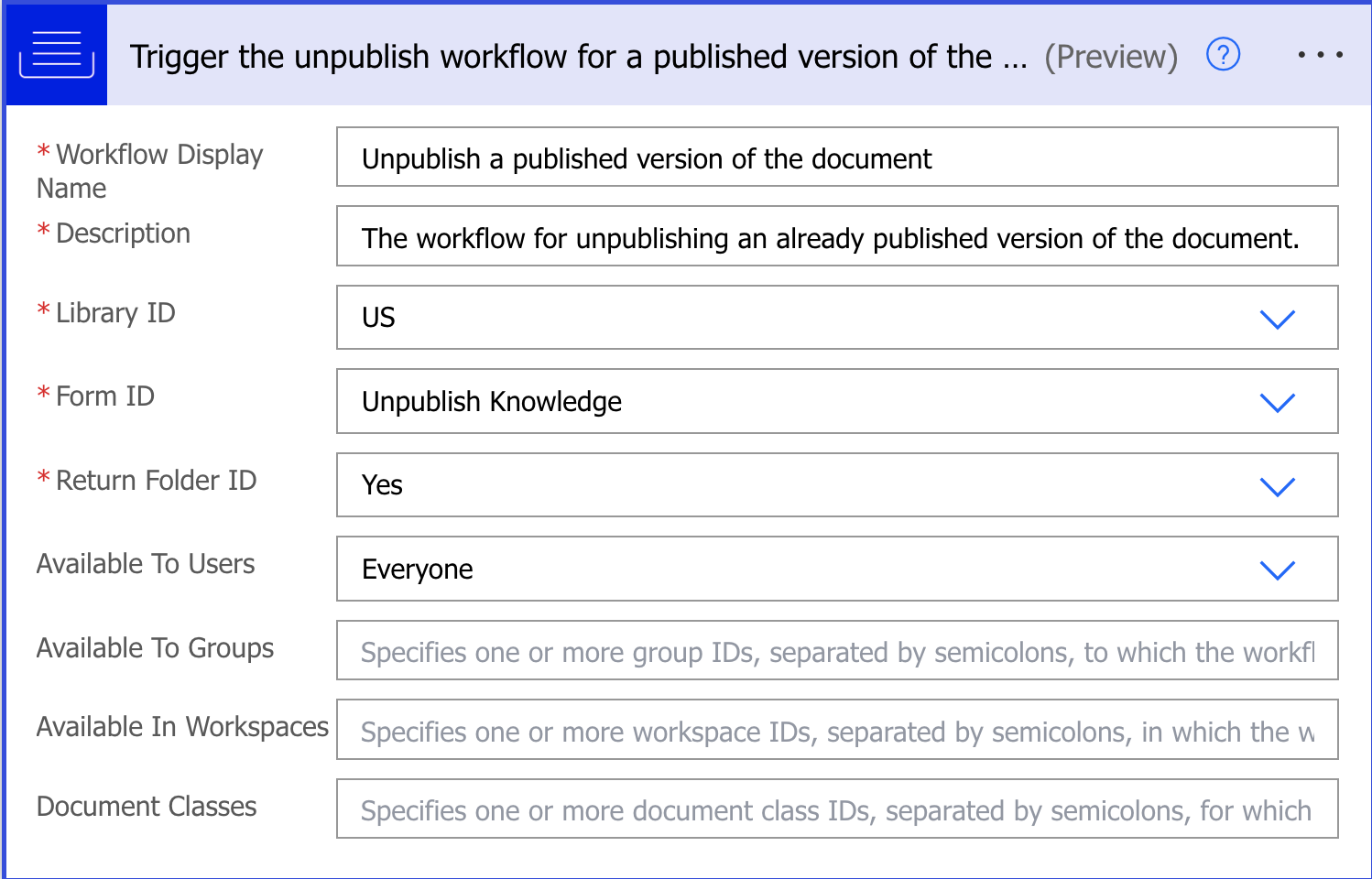 Library ID: Specify the Knowledge library ID where the workflow must be available.
