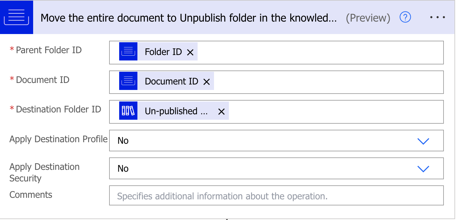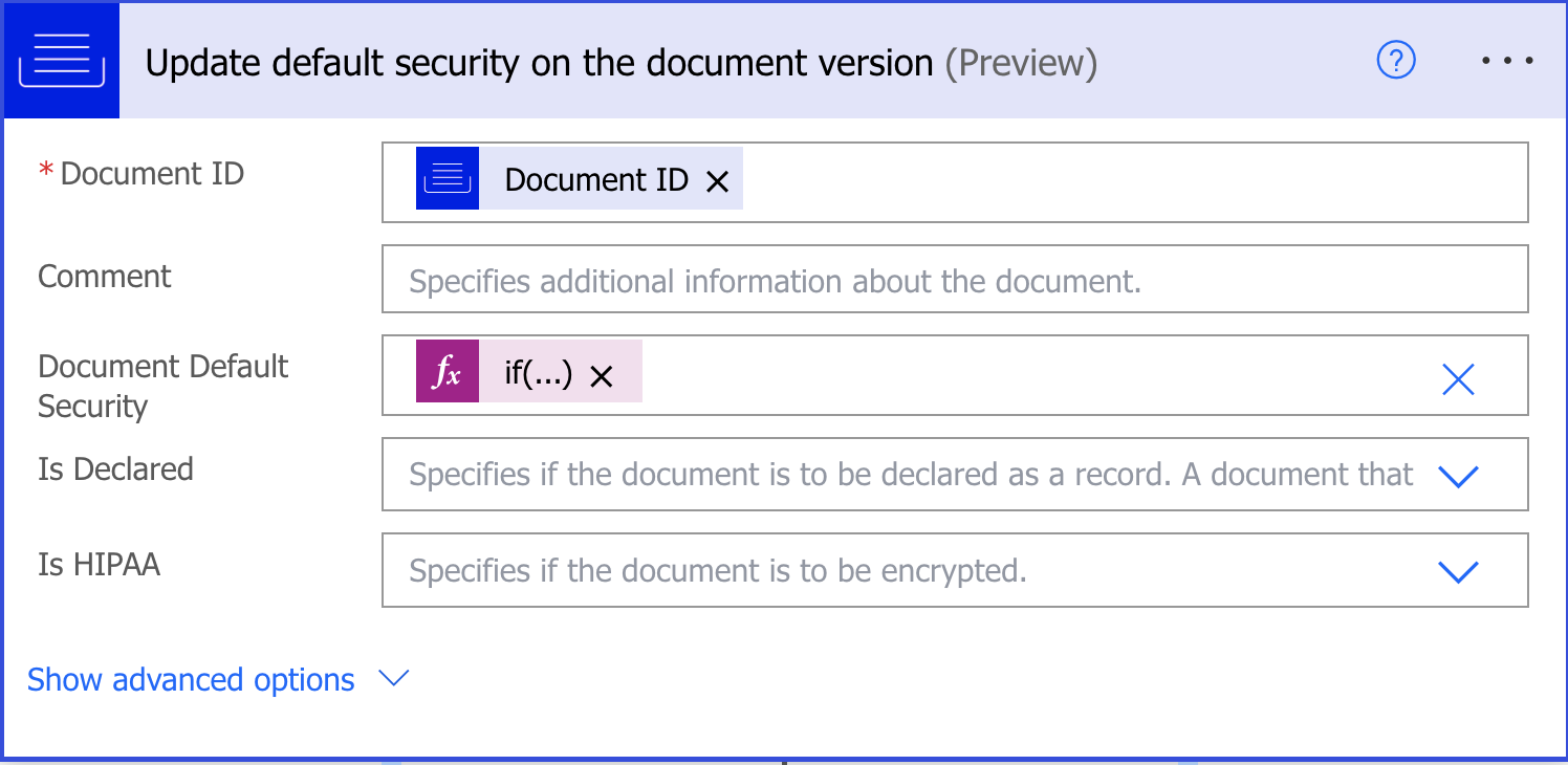 Return Folder ID: Specifies if the document’s folder ID is required by the workflow. This is helpful if you want to use a specific folder where the selected document is located further in your Power Automate script. Set this value to Yes.