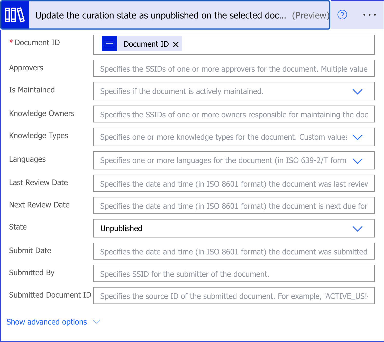 iManage Insight Plus connector Description: Update the curation state as unpublished on the selected document version |