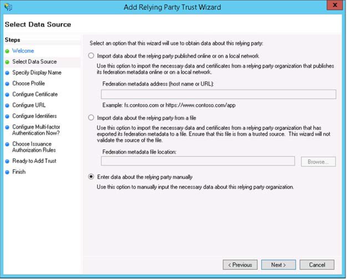 The Select Data Source tab is displayed, as shown in the following figure:Figure:Select the Enter data about the relying party manually option and select Next.
