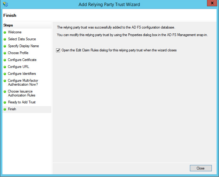 Follow the onscreen prompts to accept the default options until you reach the last (Finish) screen. After adding a relying party trust, you must add the claim rules for your relying party. For more information on adding the claim rules for your relying party, see Adding Claim Rules for the Relying Party.Ensure you select the Open the Edit Claim Rules dialog for this relying party trust when the wizard closes check box, as shown in the following figure: