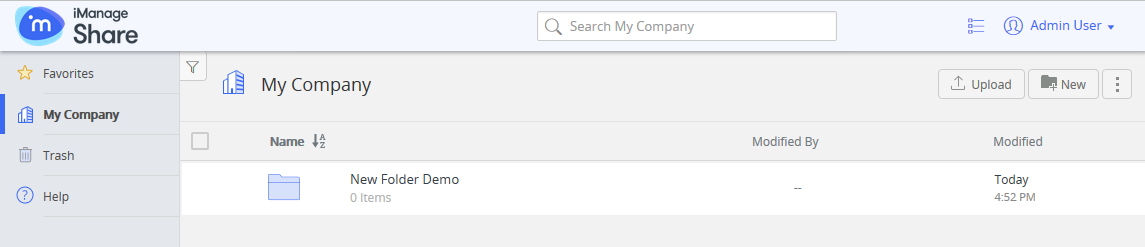 The New Folder in My Company screen is displayed that indicates where the new folder will be created, as shown in the following figure:Figure: New folder in my companyType a name for the folder and select Create.