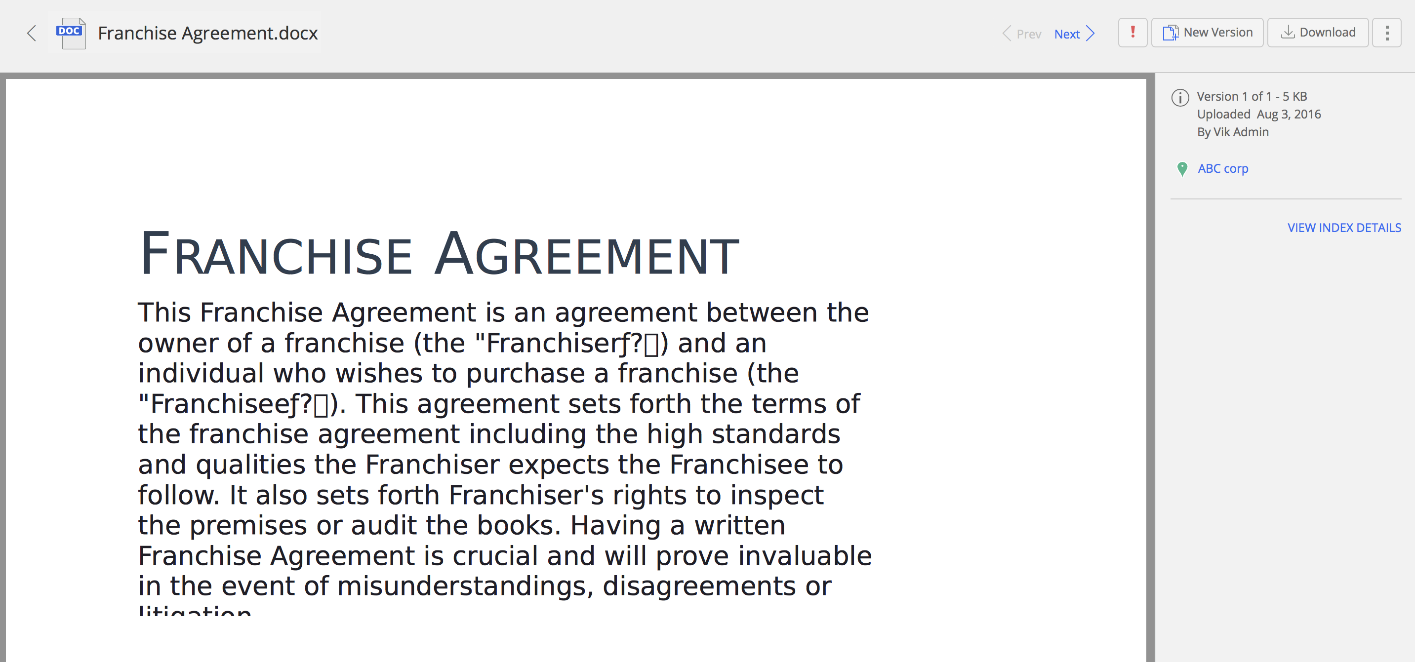 The Document view is available when you select a specific document from a folder or search list, as shown in the following figure: