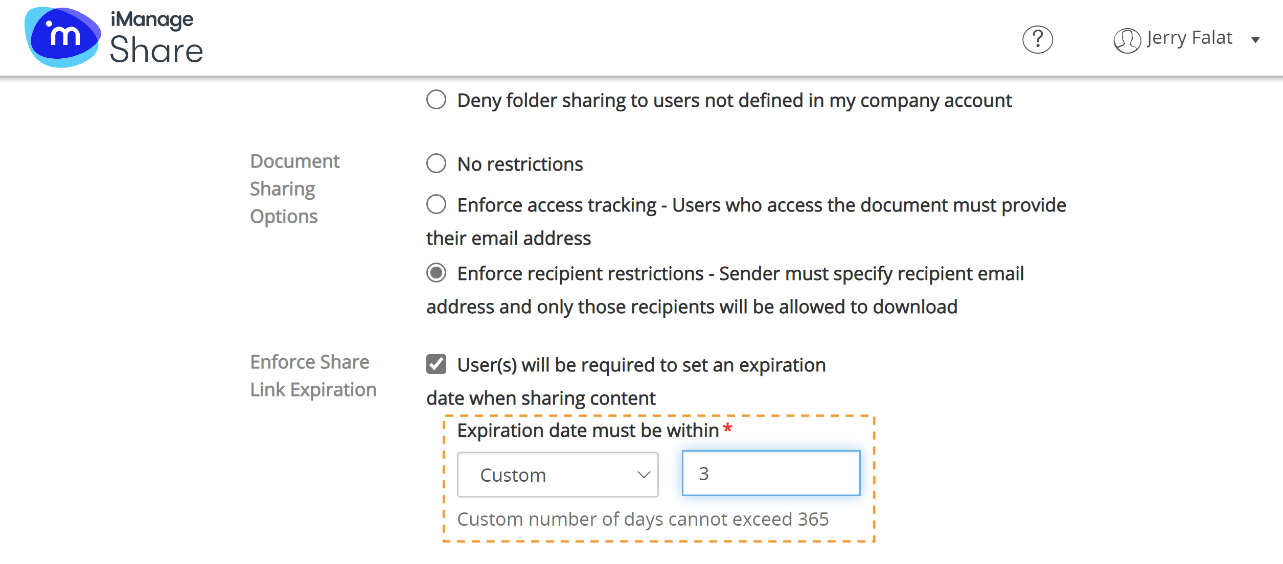 Administrators now have more control over the sharing permissions offered to the users with the option to enforce and set the maximum duration restriction on the expiration date, to ensure that the files shared by users to external recipient(s) from their company are accessible only for a stipulated amount of time.