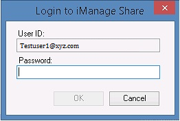 If your administrator has setup a trusted gateway between iManage Work and iManage Share, then your iManage Work credentials are used to logon to iManage Share when the process is initiated. If the trusted gateway is not enabled, you are prompted to enter your iManage Share credentials in the dialog box that opens, as shown in the following figure: