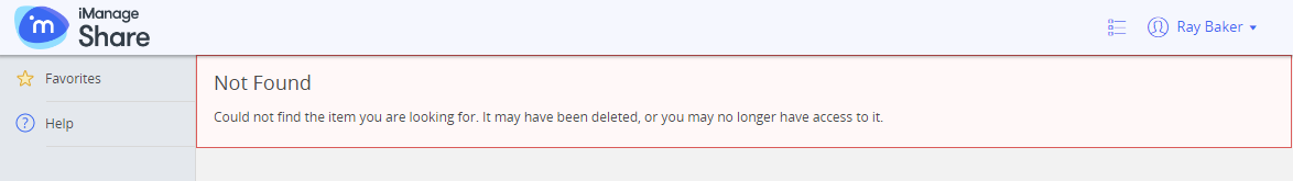 If share access for a folder is revoked for a recipient, or if the recipient tries to share the link with someone who does not have an access to the folder, a Not Found message is displayed, as shown in the following figure:
