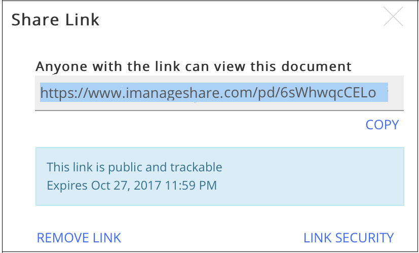 iManage recommends you to enable the Restricted (email list) feature for additional security on the Share Link. For more information, see Using the Restricted (email list) Feature.
