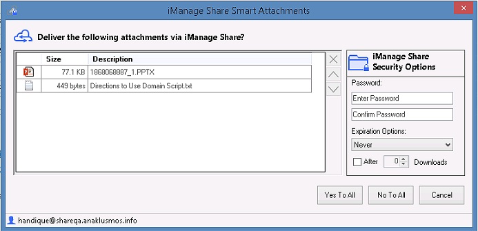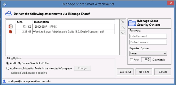The dialog closes and an email is sent, with secure links in place of any attachment listed in the Smart Attachments window.No to All: closes the dialog.