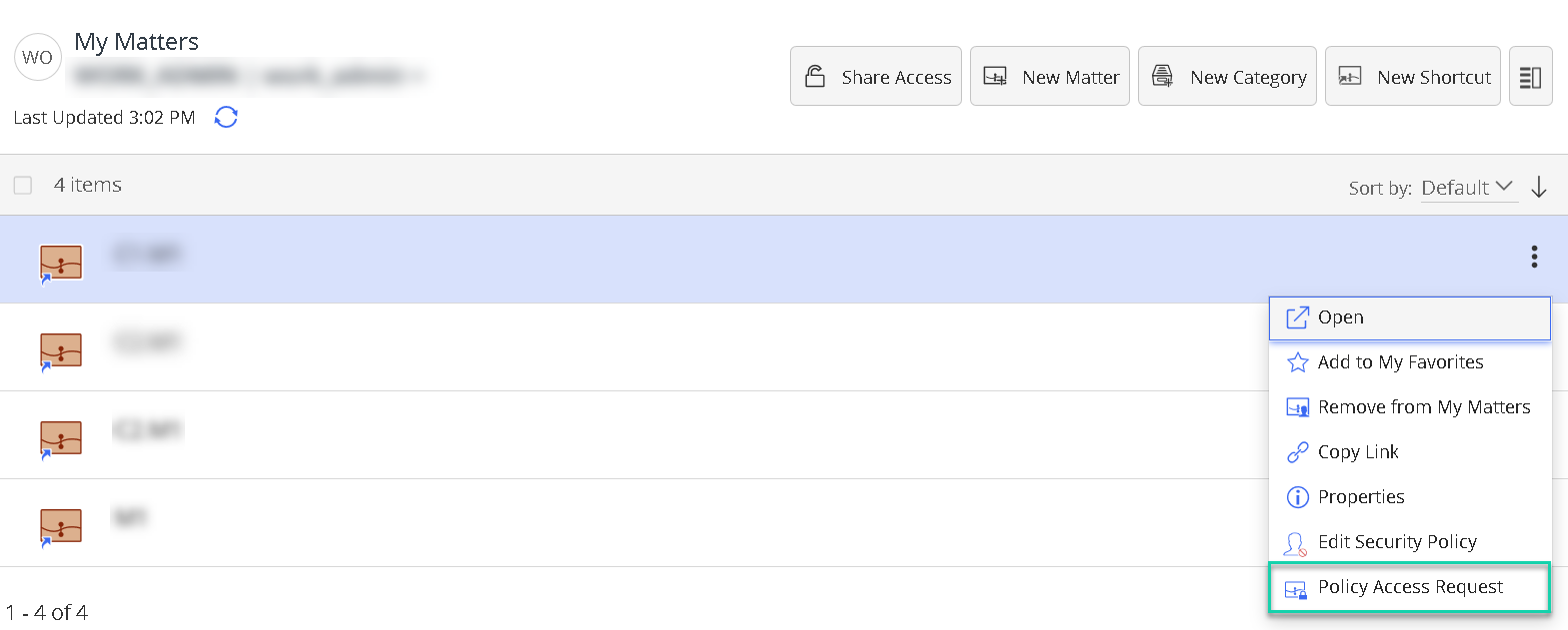 Figure 1b: Policy Access Request option on the matter page in iManage Work