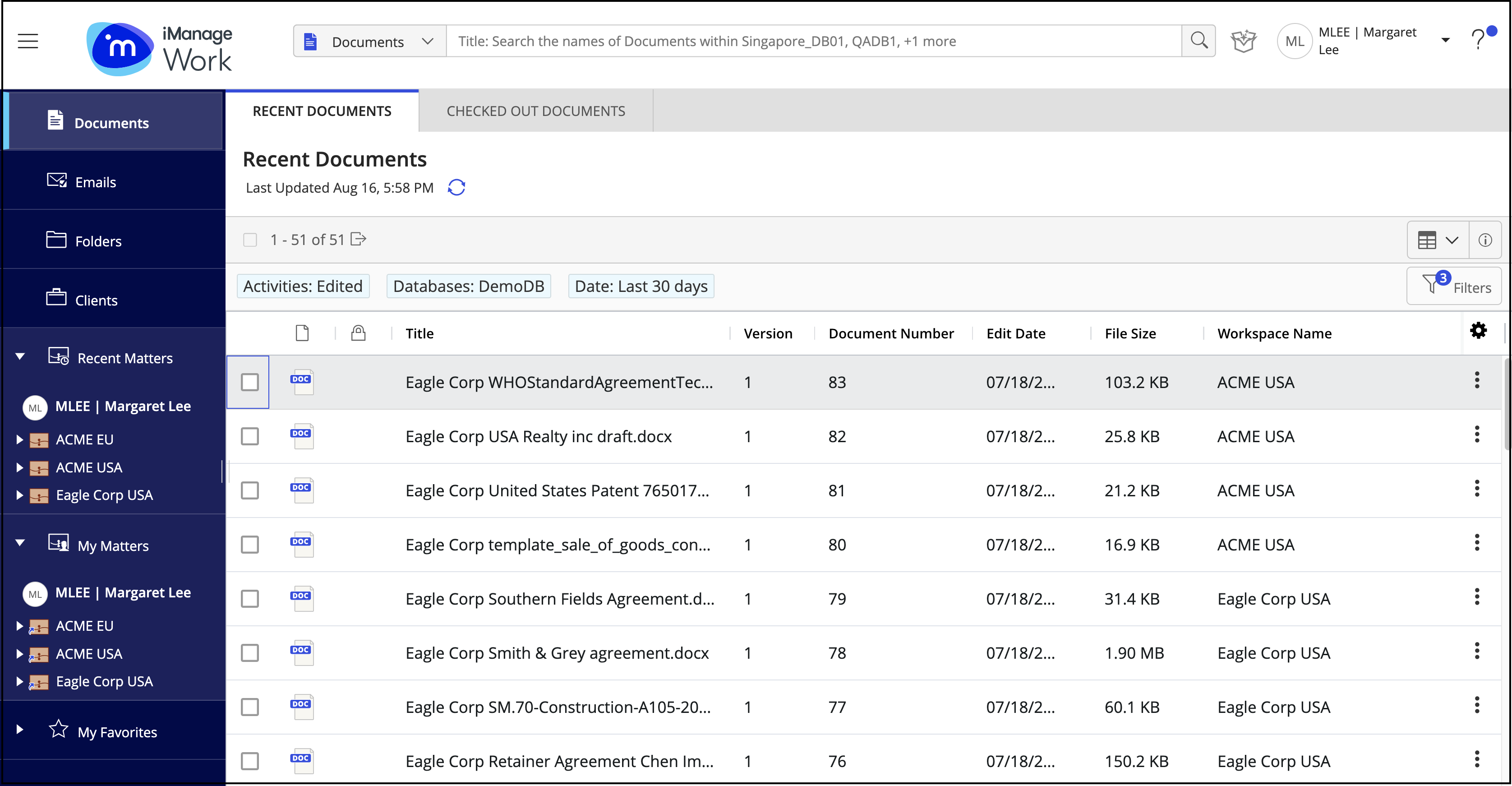 Access workspaces under Recent Matters and My Matters in a single flat list that is sorted alphabetically.
